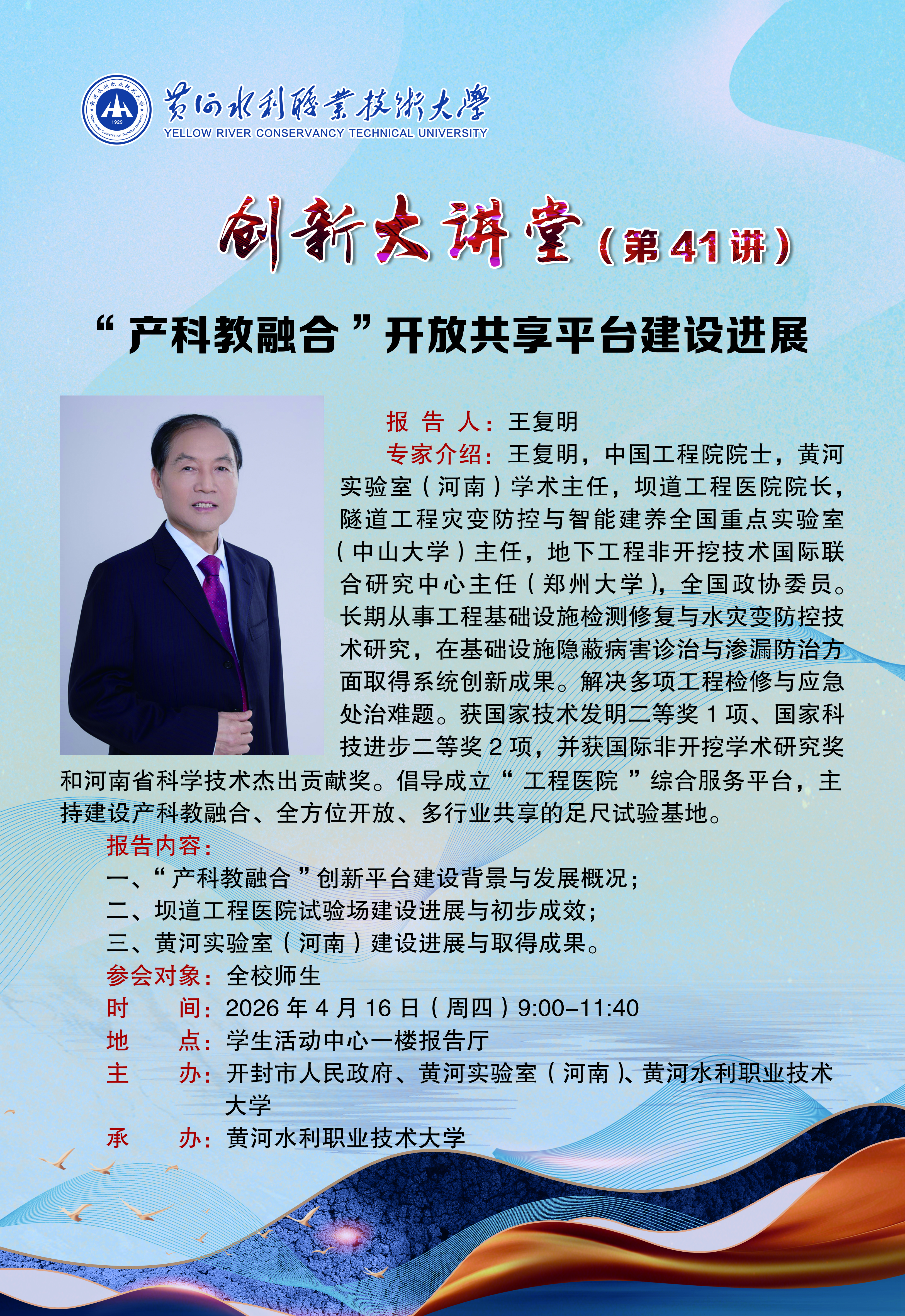 为进一步拓宽师生学术视野、厚植水利专业情怀,精准对接国家水安全战略需求,助力高素质技术技能水利人才培养,4月13日,我校在学生活动中心报告厅成功举办“我国现代治水实践与未来创新路径”创新大讲堂。活动特邀郑州大学水利与交通学院教授、黄河生态保护与区域协调发展研究院院长、水科学研究中心主任左其亭担任主讲嘉宾。副校长朱焕立主持讲座,水利工程学院等全校600余名师生现场聆听学习。活动现场校长胡昊为左其亭教授...