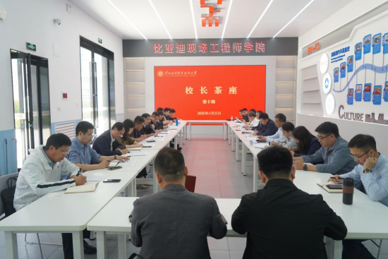 4月23日,我校在比亚迪现场工程师学院召开第十期校长茶座,校长胡昊,副校长菅浩然、朱焕立、周志琦,纪委书记刘许亮出席会议。各学院院长和相关部门负责人参会。会议由胡昊主持。