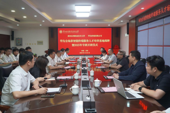 5月27日,黄河水利职业技术大学与华为终端有限公司共同举行华为全场景智能终端服务人才培养基地揭牌暨2025年专班开班仪式。黄河水利职业技术大学党委副书记、校长胡昊,副校长朱焕立,教务处和电气工程学院相关负责人,华为中国终端全屋智能交付与服务总监王铁柱、华为河南终端业务部服务总监赵俊、华为河南终端业务部全屋智能总监曾凤明等师生代表和企业代表出席仪式。仪式由电气工程学院院长王磊主持。