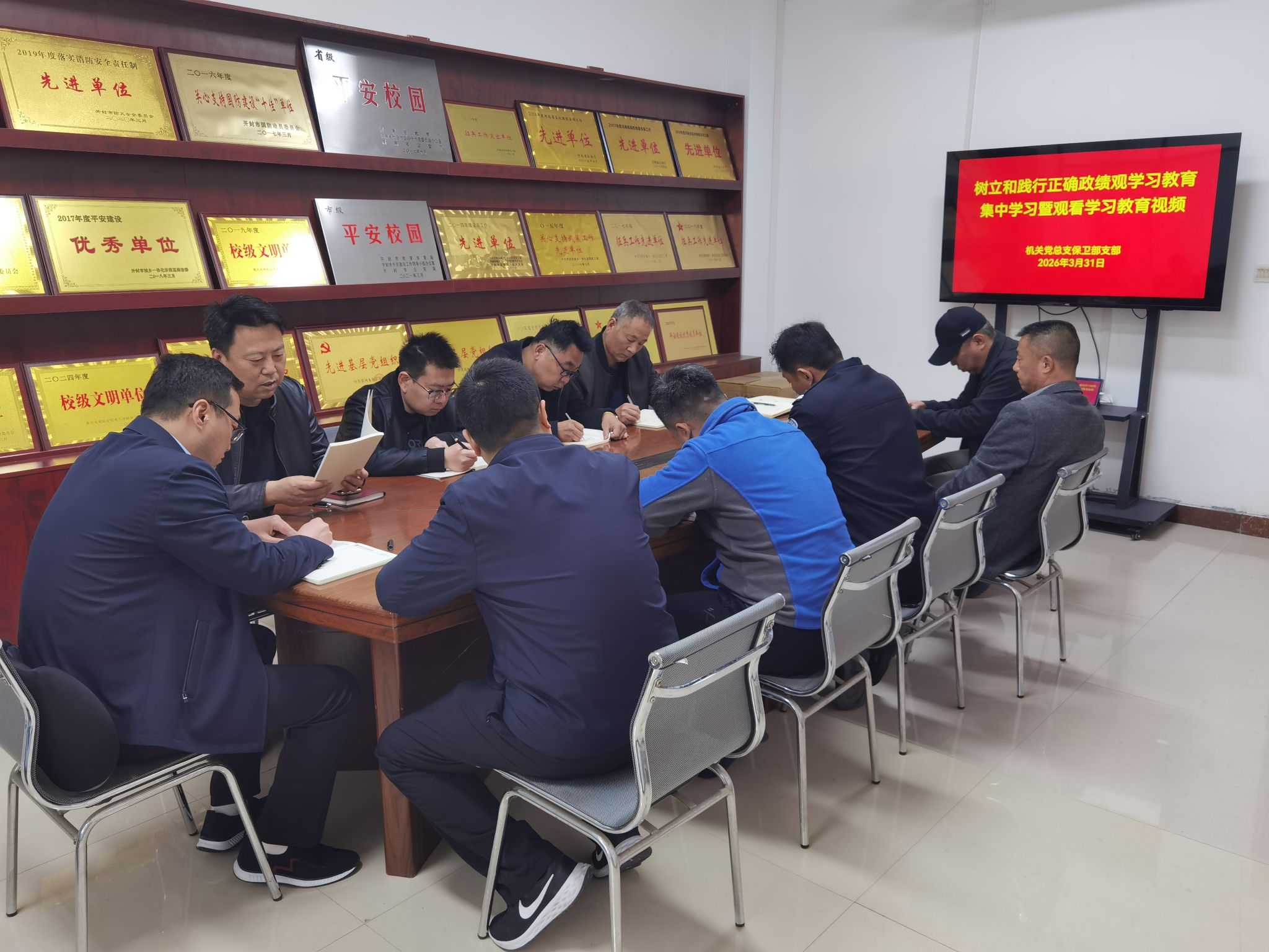 2026年3月31日,机关党总支保卫部支部开展树立和践行正确政绩观学习教育集中学习暨观看学习教育视频,主要学习了《习近平关于树立和践行正确政绩观论述摘编》部分内容,并观看了树立和践行正确政绩观学习教育部分视频,全体党员参加。
