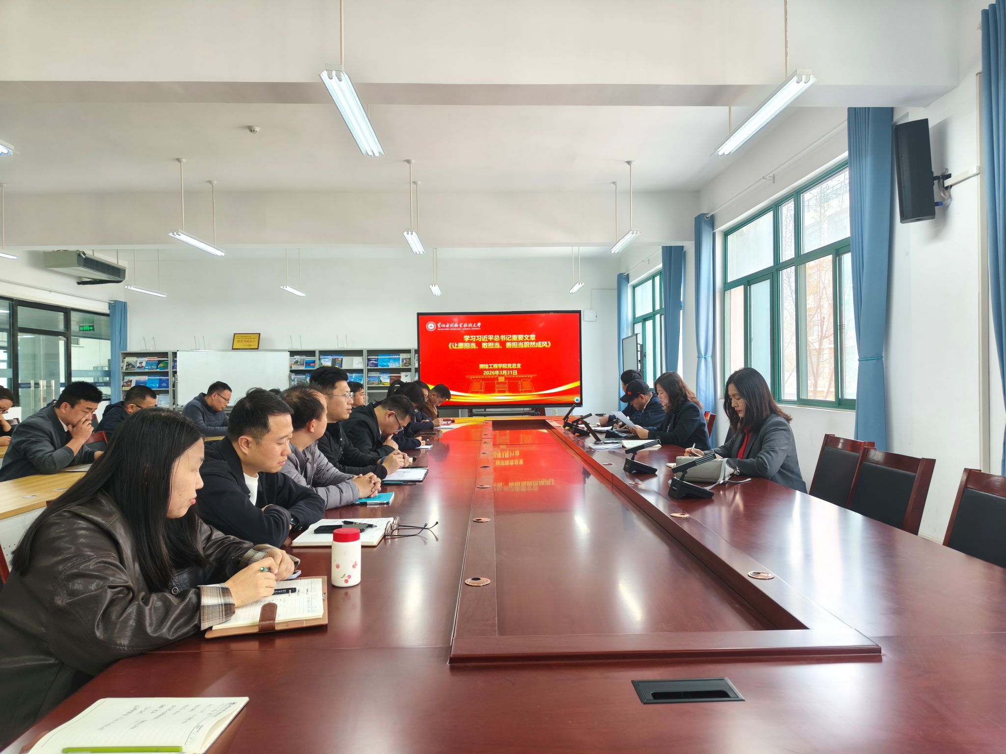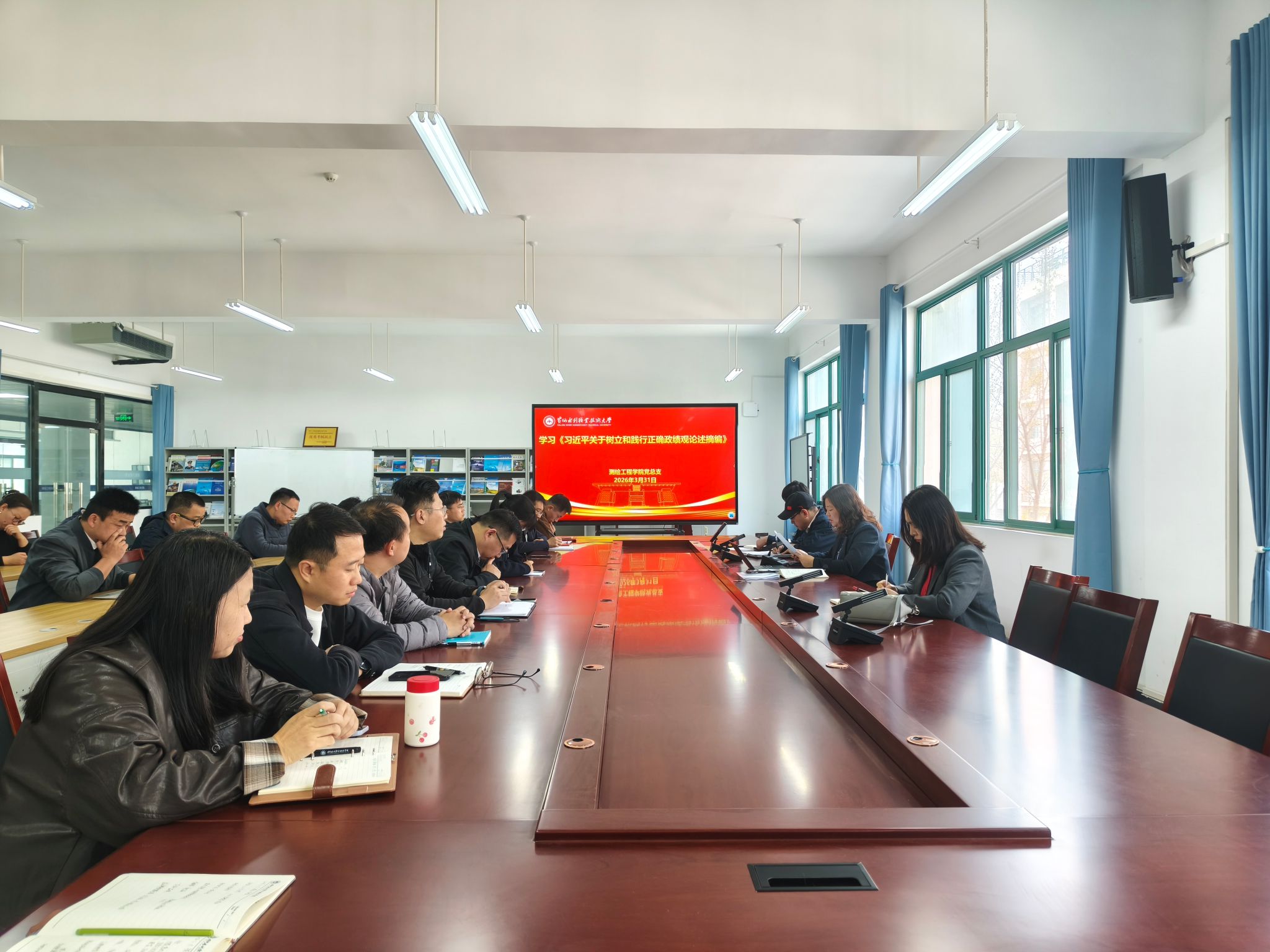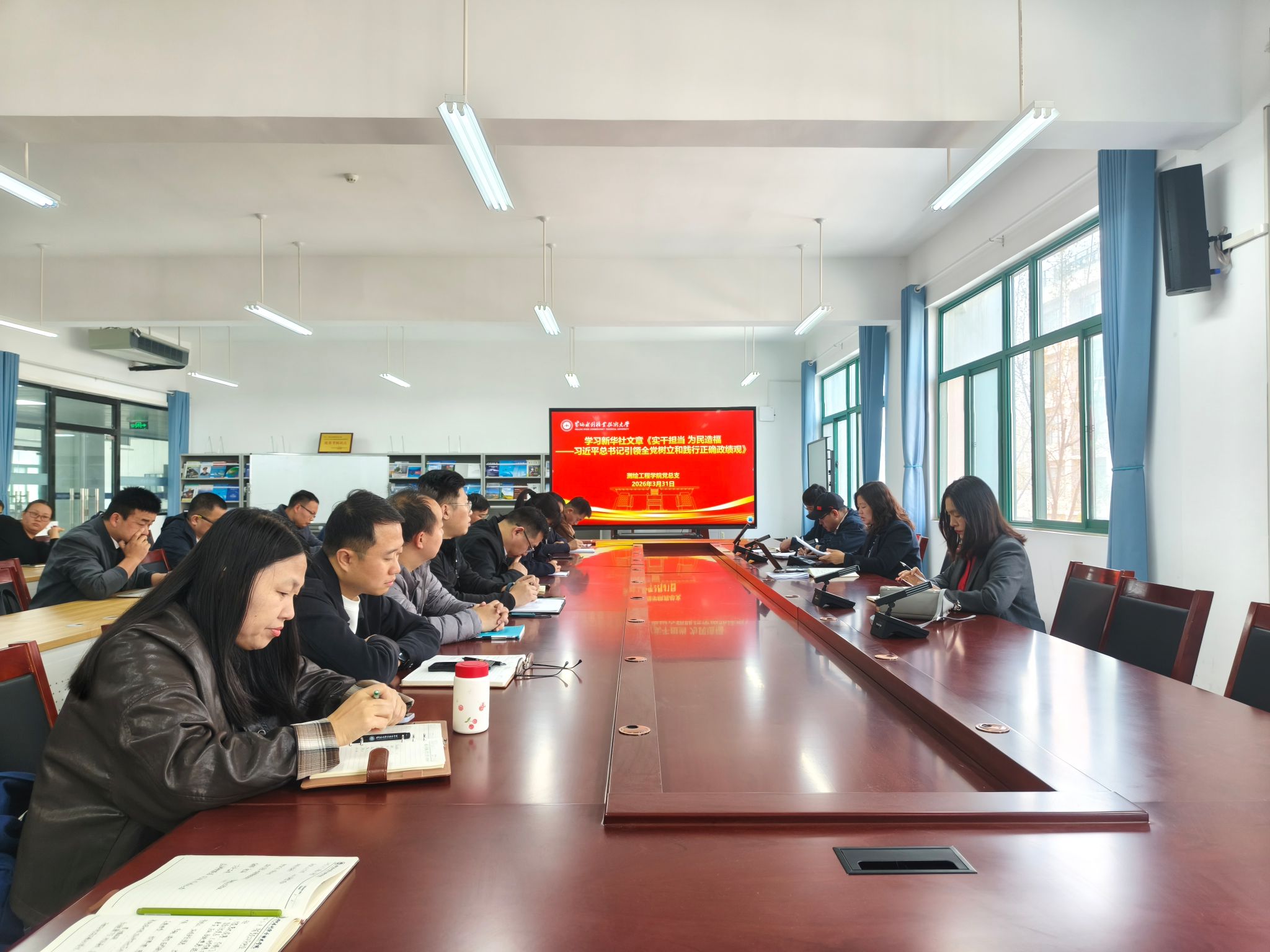 3月31日,测绘工程学院在SY6307开展2026年上半年第二次政治理论学习专题会,党总支书记高琼领学《习近平关于树立和践行正确政绩观论述摘编》、习近平总书记重要文章《让愿担当、敢担当、善担当蔚然成风》和新华社文章《实干担当为民造福——习近平总书记引领全党树立和践行正确政绩观》。