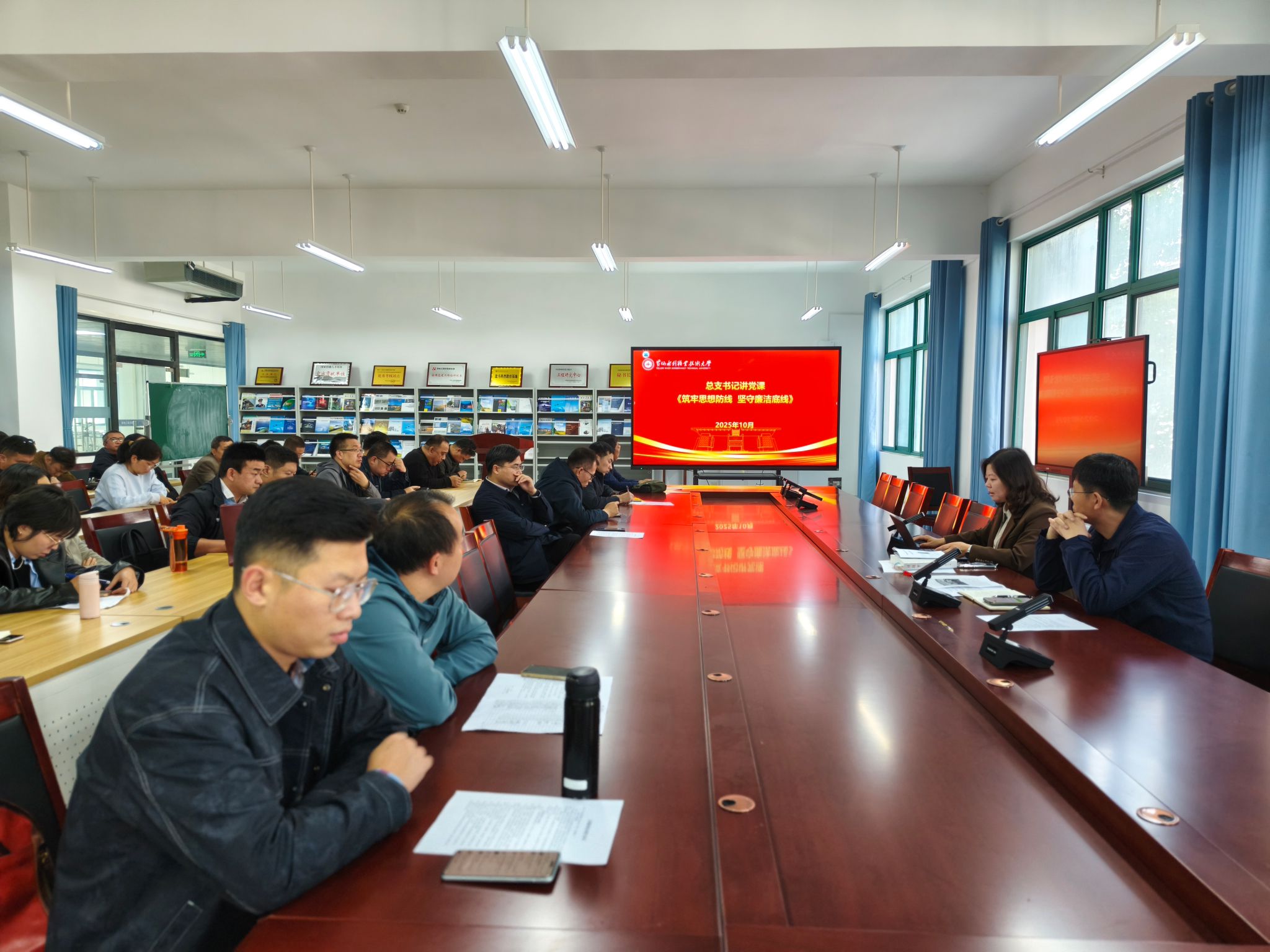 10月14日,测绘工程学院党总支书记高琼在6号实训楼6307会议室,以《筑牢思想防线,坚守廉洁底线》为题给全院教职员工讲专题党课。