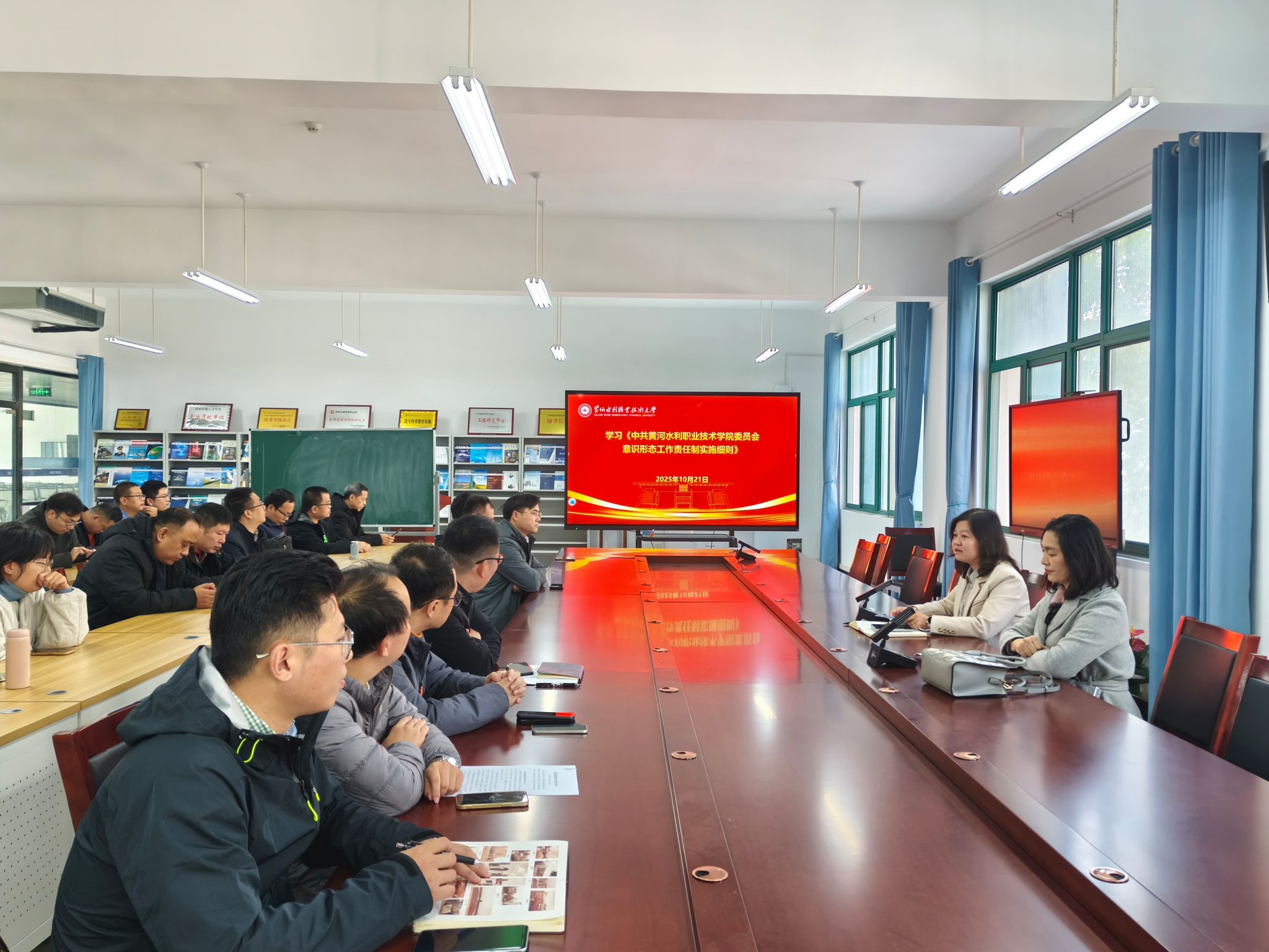 10月21日,测绘工程学院在SY6307开展2025年下半年第四次政治理论学习专题会。党总支书记高琼领学《中共黄河水利职业技术学院委员会意识形态工作责任制实施细则》和《中共黄河水利职业技术学院委员会网络意识形态工作责任制实施细则》。