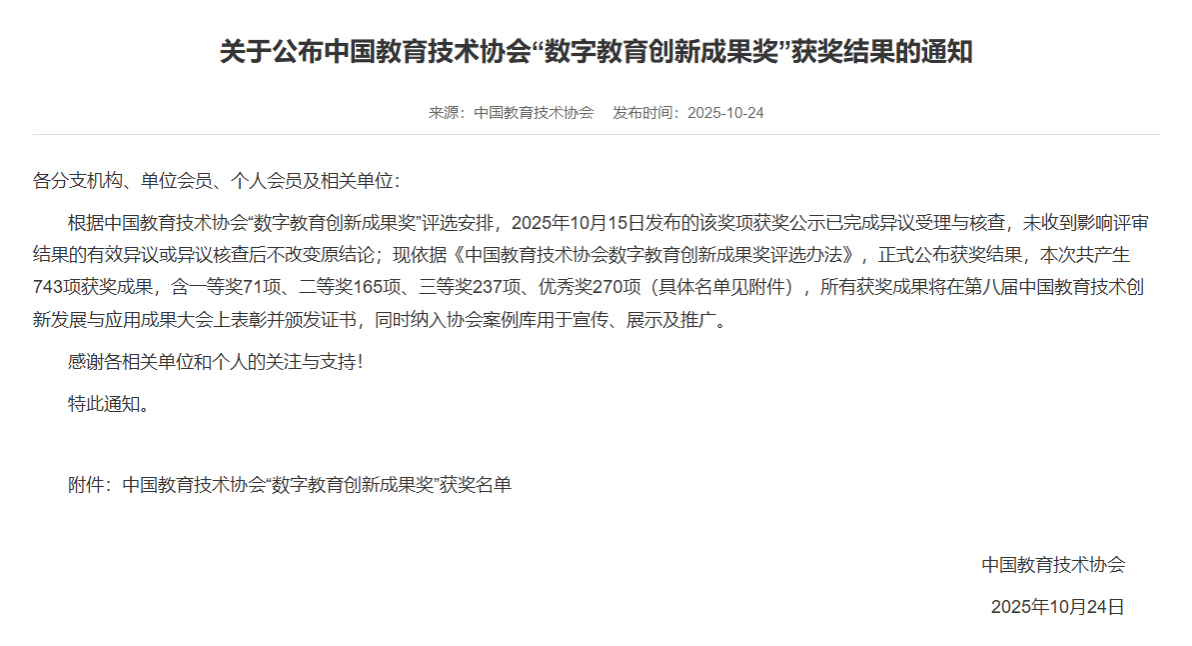 中国教育技术协会“数字教育创新成果奖”是为深⼊实施国家教育数字化战略行动,充分发挥创新成果的示范引领作用,表彰数字教育领域的卓越实践者,中国教育技术协会特⽴的中国教育技术协会数字教育创新成果奖(简称“数字教育创新成果奖”),授予在教育数字化领域中做出卓有成效实践创新的成果。本次共产生743项获奖成果,含一等奖71项、二等奖165项、三等奖237项、优秀奖270项,所有获奖成果将在第八届中国教育技术创新发展与应用成果大会上表彰并颁发证书,同时纳入协会案例库用于宣传、展示及推广。