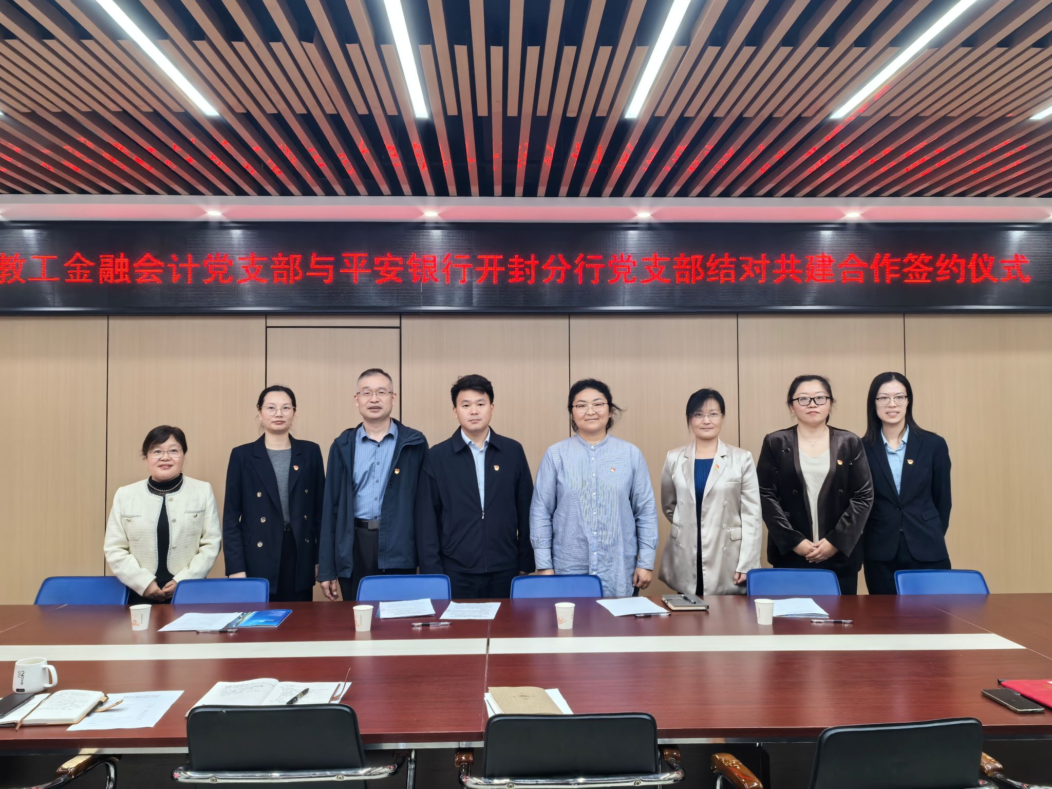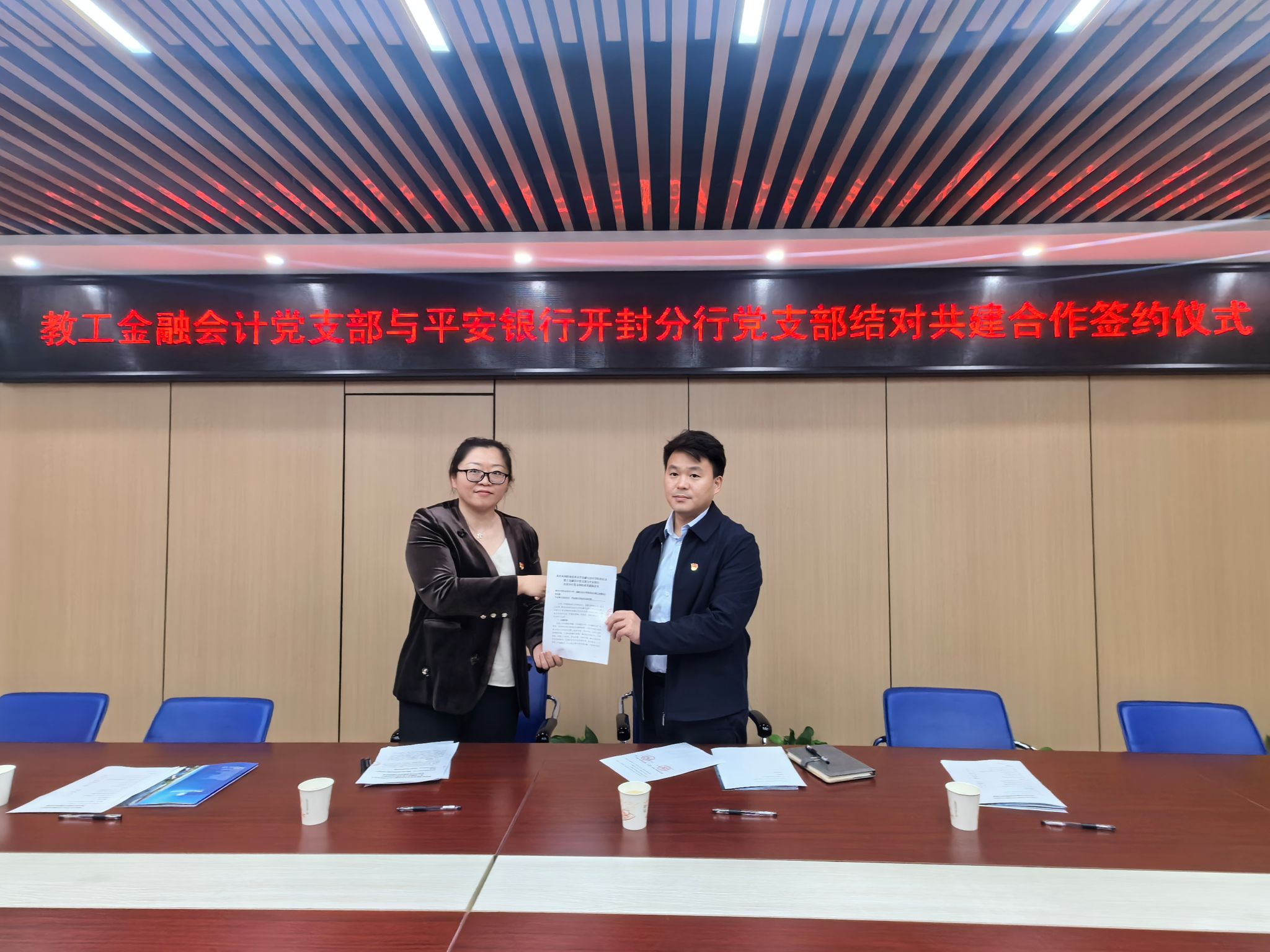 为充分发挥高校与金融机构党组织的优势互补作用,构建“资源共享、优势互补、互相促进、共同提高”的党建工作新格局,10月15日,金融与会计学院教工金融会计支部与平安银行开封分行党支部举行结对共建签约仪式。学院领导班子、平安银行开封分行行长、党支部书记吉龙及双方党支部党员代表出席仪式。