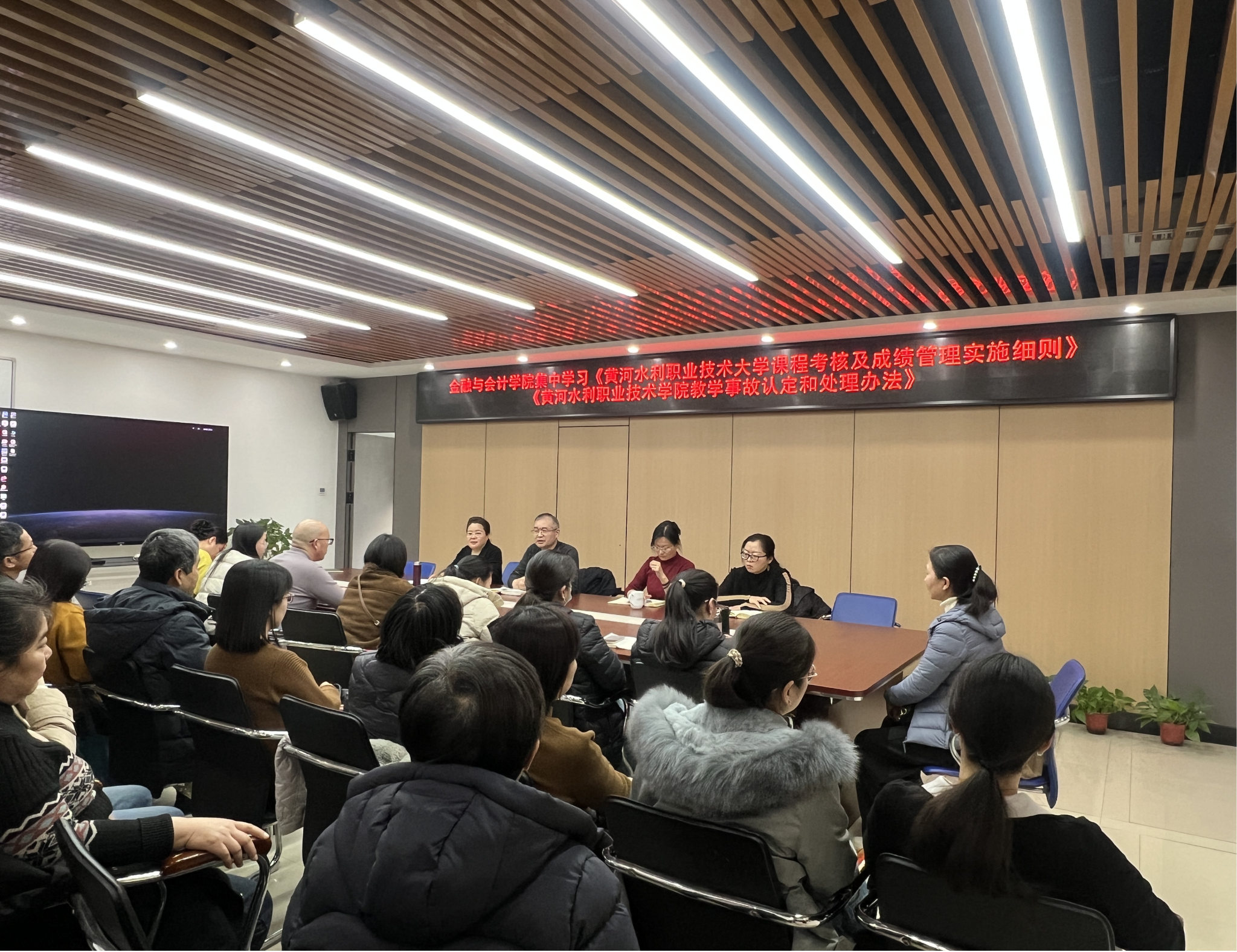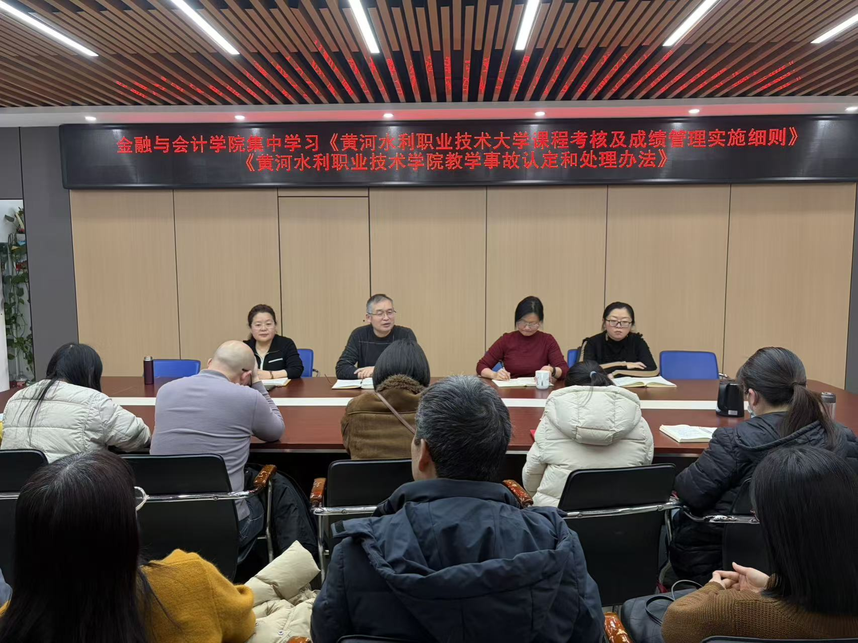 为进一步规范教学管理行为,严肃教学纪律,提升教育教学质量,1月13日下午,金融与会计学院在SY5412组织开展教学管理制度专题学习,集中学习《黄河水利职业技术大学课程考核及成绩管理实施细则》《黄河水利职业技术学院教学事故认定和处理办法》。学院领导班子及全体教师参加学习。