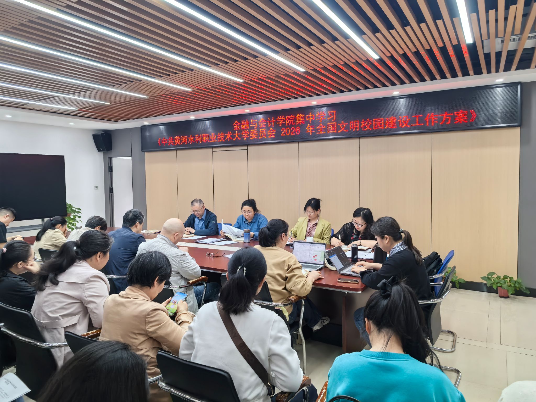 4月14日下午,金融与会计学院在SY5412会议室召开精神文明专题学习会,集中学习《中共黄河水利职业技术大学委员会 2026 年全国文明校园建设工作方案》,全体教职工参会,会议由院长吴宗奎主持。