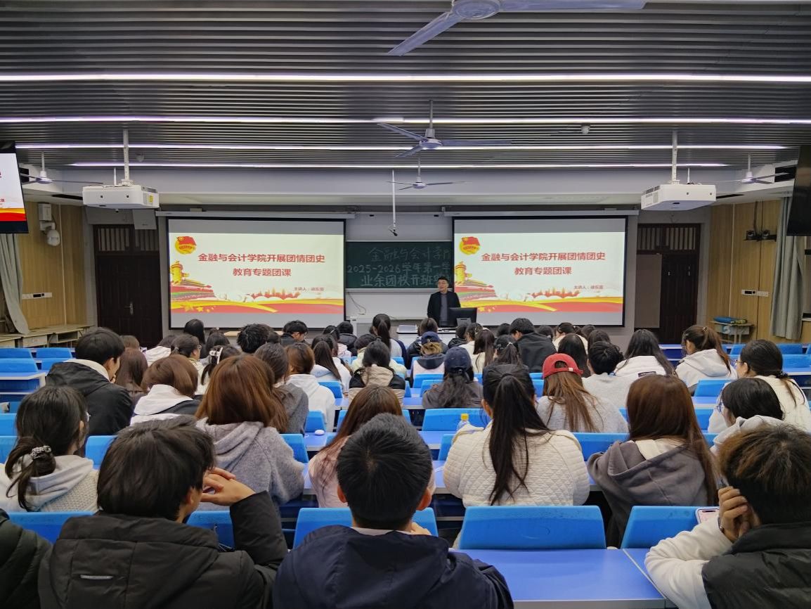 为加强团员青年理想信念教育,提升基层团组织凝聚力,11月6日下午,金融与会计学院分团委在JX2102教室组织开展团情团史教育专题团课。2025-2026学年第一学期业余团校全体学员参加学习,本次团课由分团委书记徐东亚主讲。