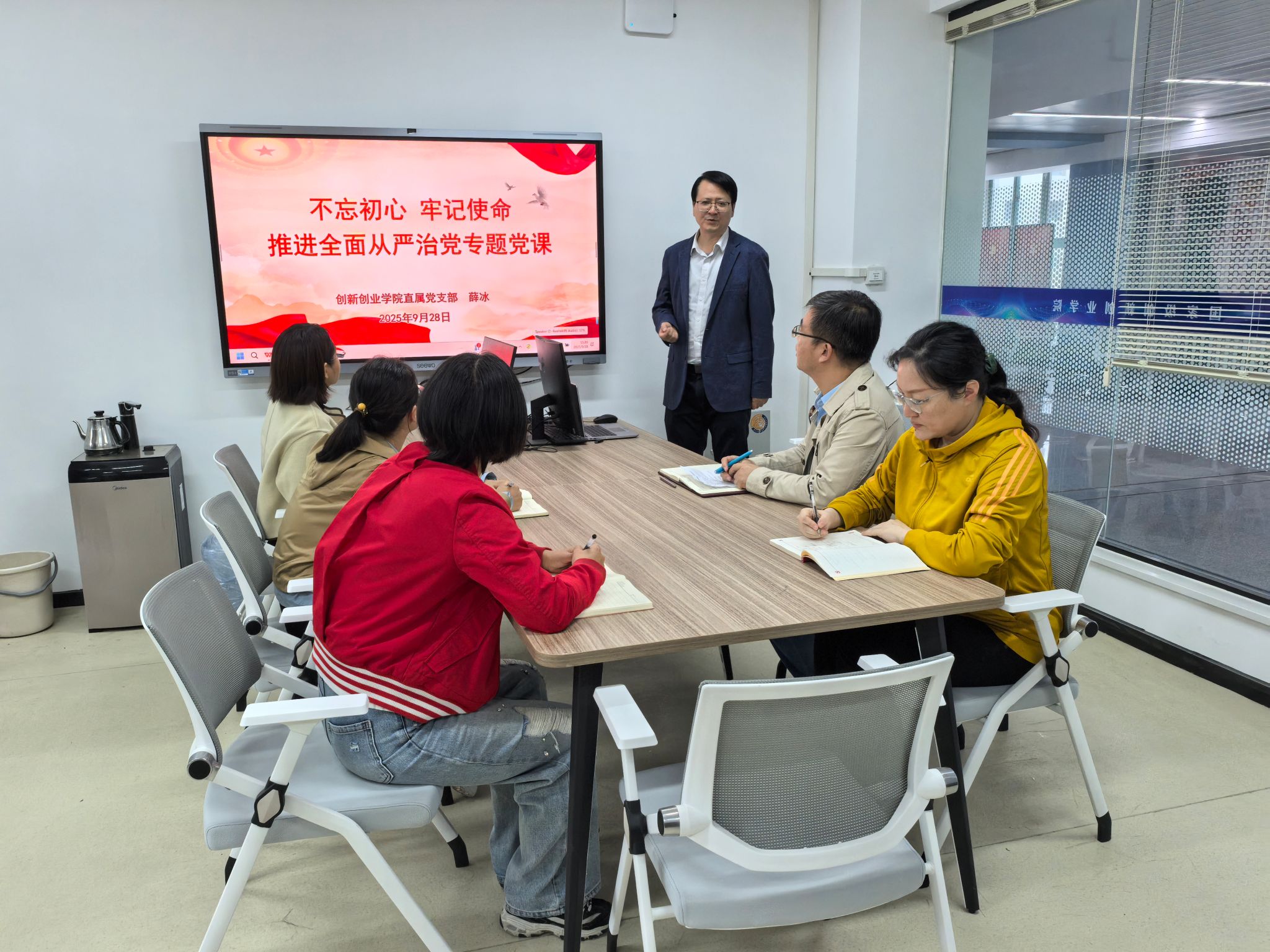 9月28日下午,创新创业学院直属党支部书记薛冰在SY7201讲授不忘初心、牢记使命,推进全面从严治党专题党课,支部全体成员参加。