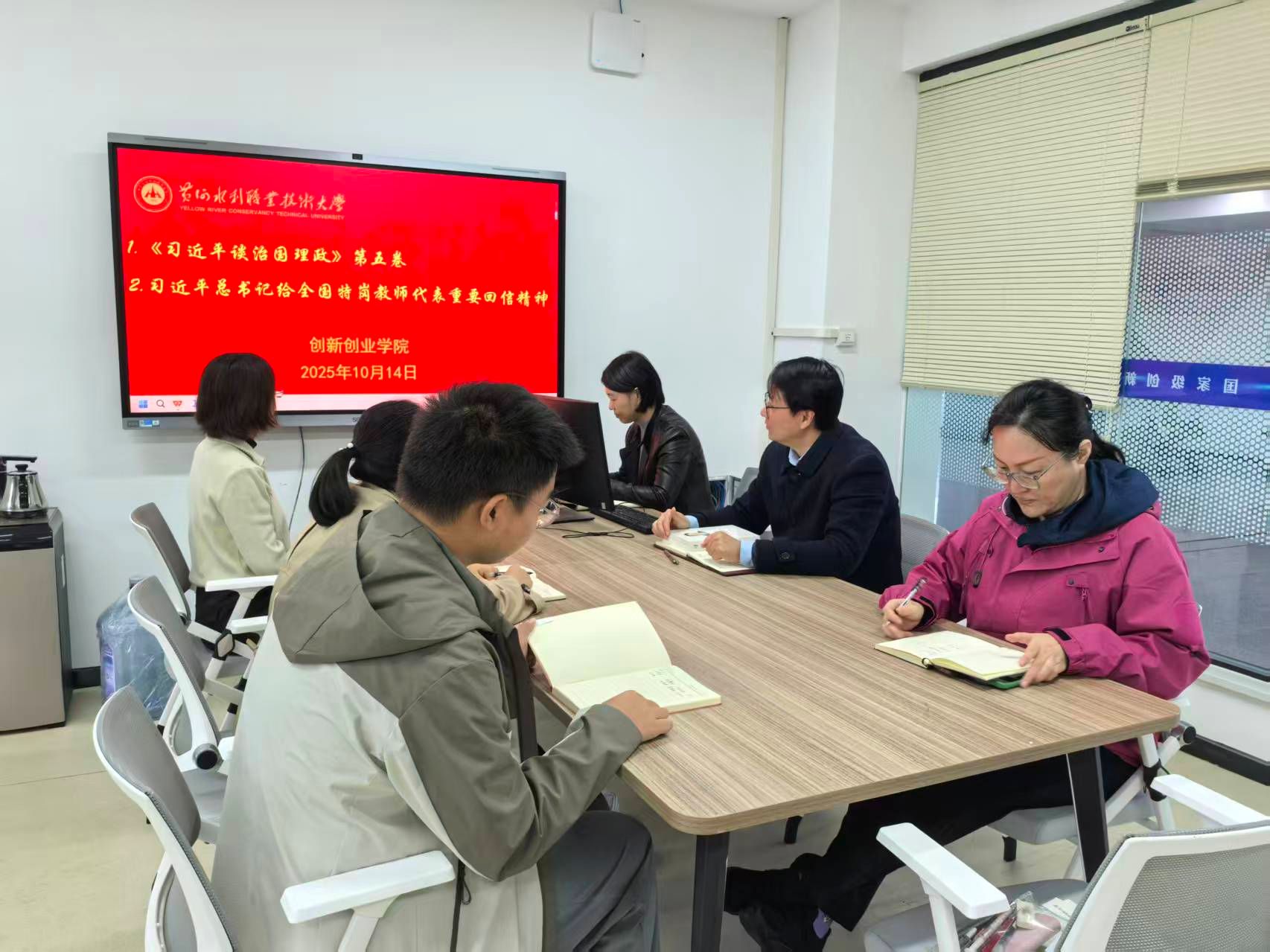 为持续深入学习贯彻习近平新时代中国特色社会主义思想,进一步贯彻落实习近平总书记关于教育的重要论述精神,10月14日,创新创业学院在SY7201开展政治理论学习,学习由创新创业学院院长薛冰主持,部门全体成员参加。