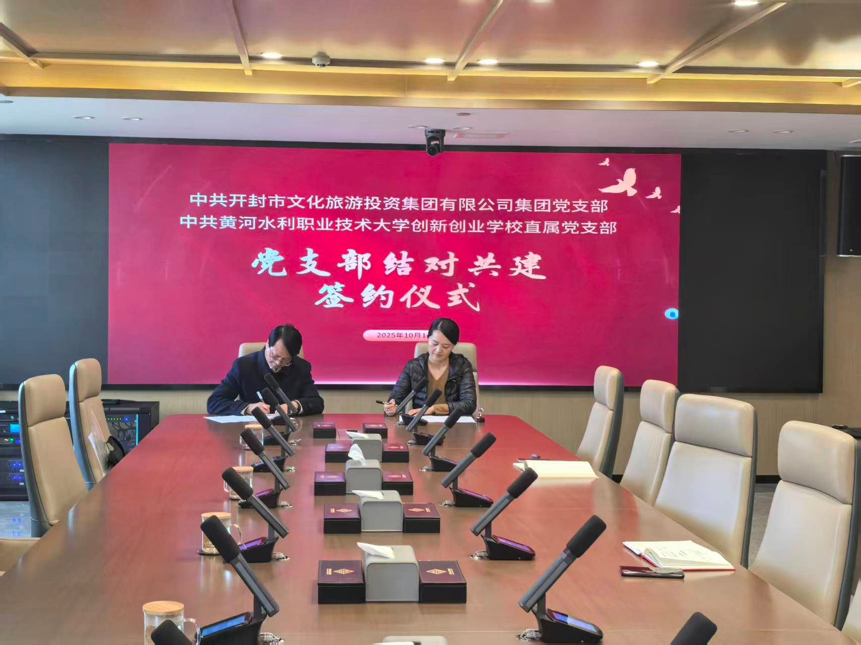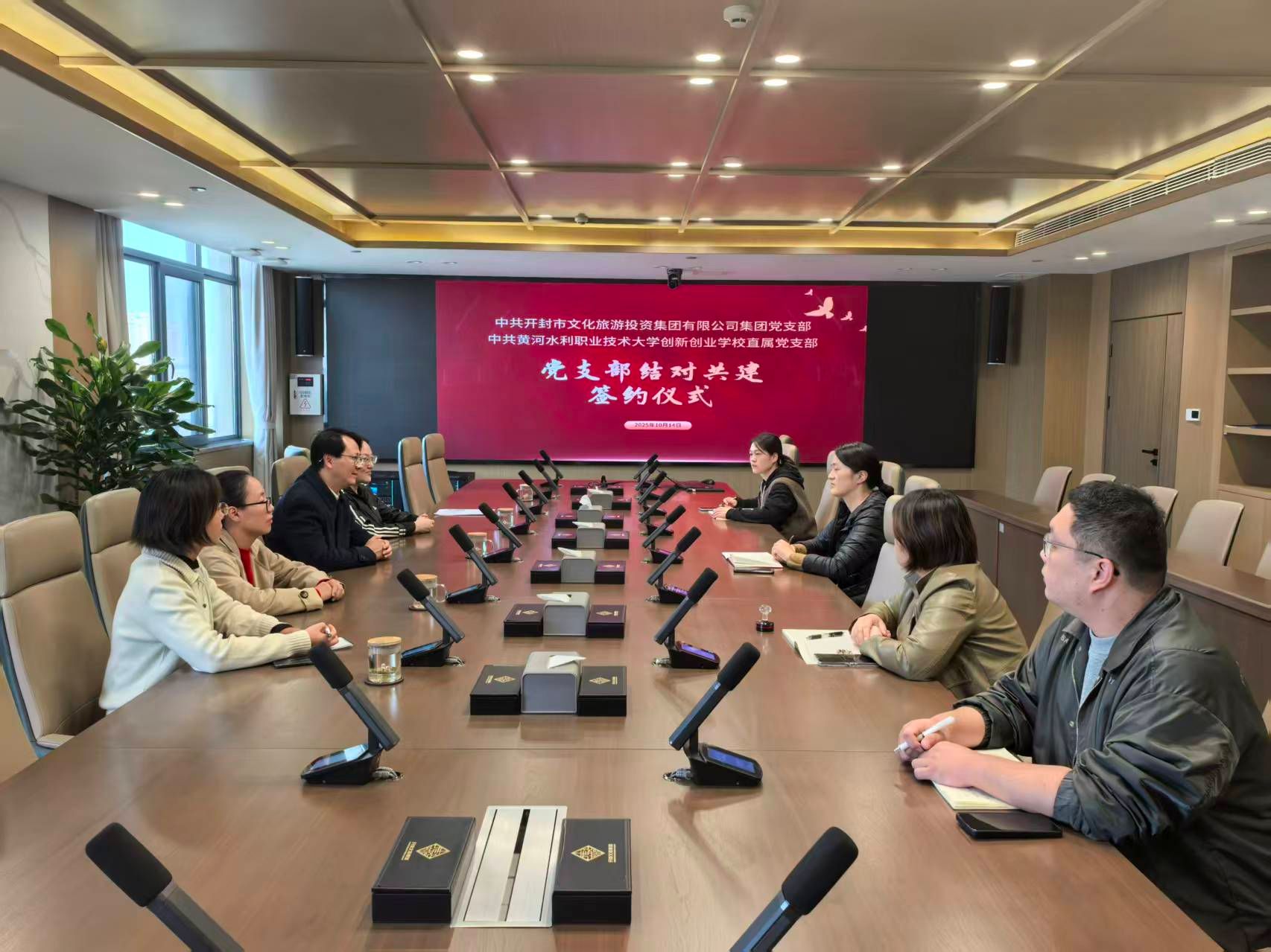 为深入学习贯彻党的二十届三中全会精神,推动党建与业务工作深度融合,深化党建示范创建与质量创优工作,10月14日,中共开封市文化旅游投资集团有限公司集团党支部与创新创业学院直属党支部在开封市文化旅游投资集团有限公司举行结对共建签约仪式。开封市文化旅游投资集团有限公司党委办公室主任刘莉莉、集团党支部代表,创新创业学院直属党支部书记薛冰、副书记余楠、支部成员参加活动。