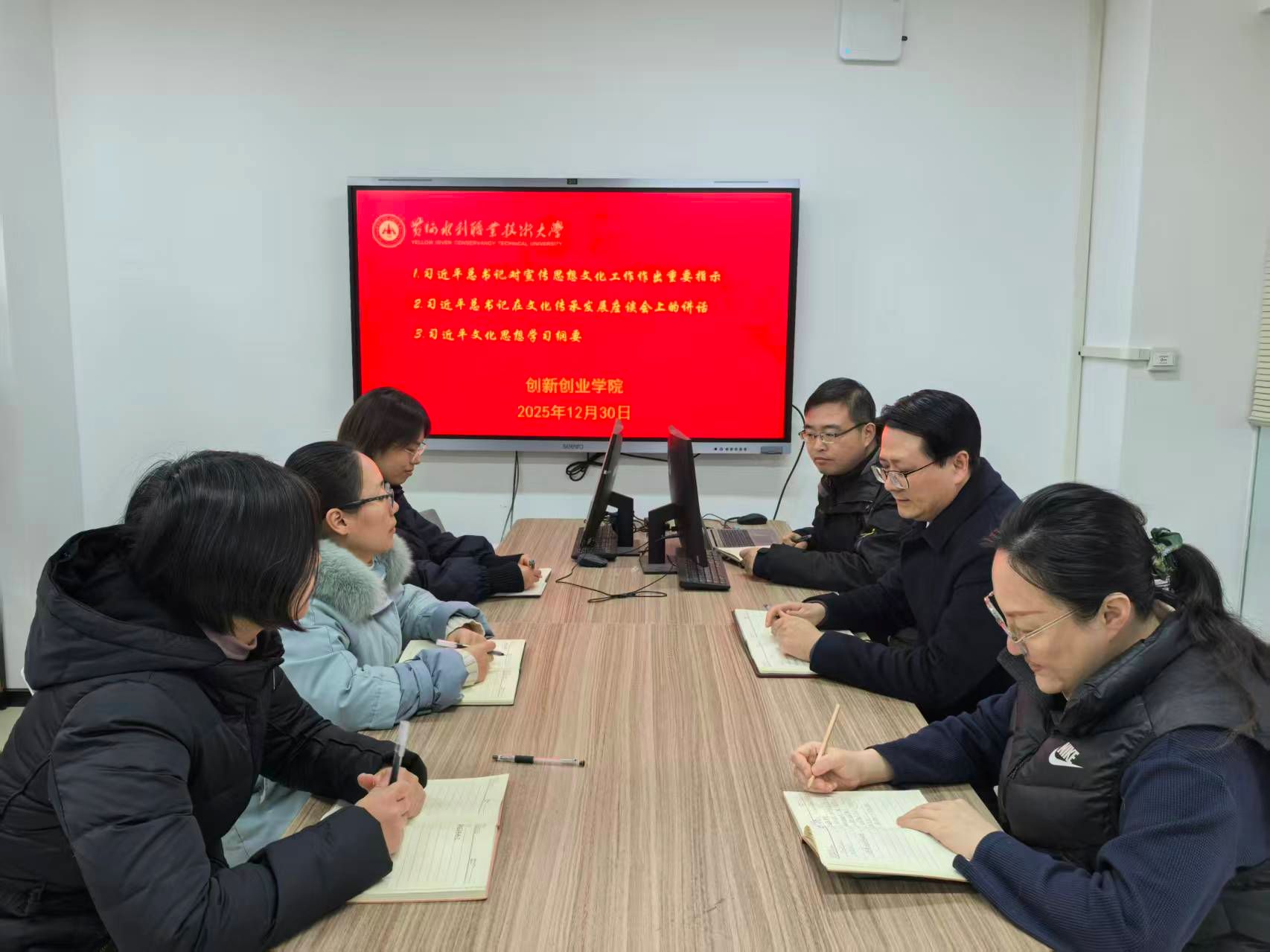 为深入学习贯彻习近平总书记关于宣传思想文化工作的重要指示精神,2025年12月30日下午,创新创业学院在SY7201开展政治理论学习,学习由创新创业学院院长薛冰主持,部门全体成员参加。