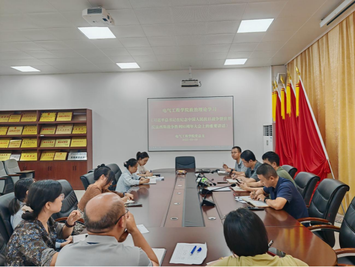 9月9日,电气工程学院党总支在会议室组织开展政治理论学习活动,深入学习习近平总书记在纪念中国人民抗日战争暨世界反法西斯战争胜利80周年大会上的重要讲话以及习近平总书记关于教育的重要论述,并传达学校新学期工作会议精神。会议由党总支书记张延主持。