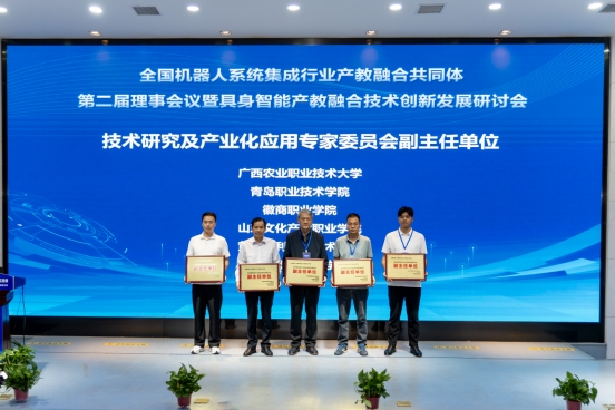 5月8日至10日,全国机器人系统集成行业产教融合共同体第二届理事会会议暨具身智能产教融合技术创新发展研讨会在郑州铁路职业技术学院举办,共同体人才培养专家委员会、教学装备开发专家委员会、技术研究及产业化应用专家委员会在本次会议上正式宣告成立,我校成功当选共同体技术研究及产业化应用专家委员会副主任单位。电气工程学院副院长沈艳河代表学校接受共同体技术研究及产业化应用专家委员会“副主任”单位授牌。