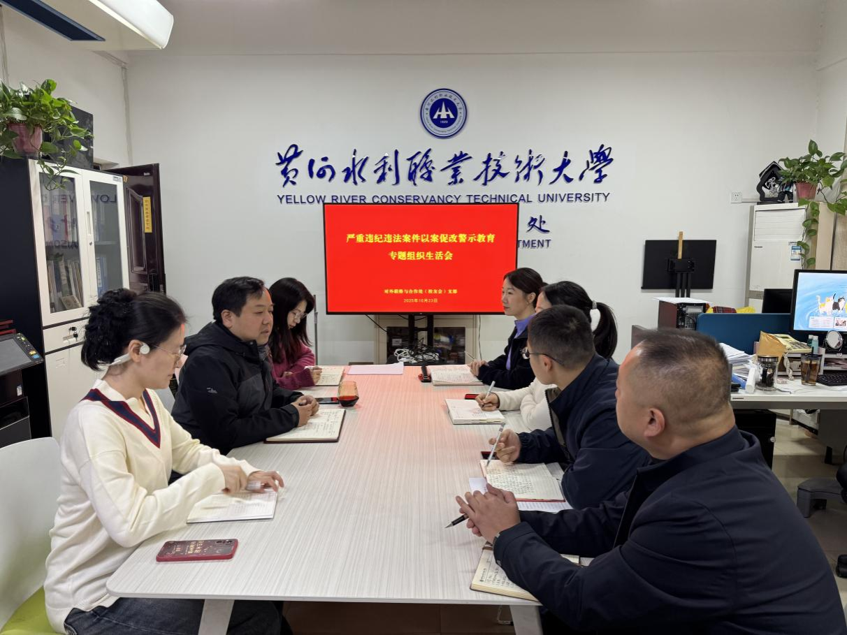 2025年10月23日,对外联络与合作处(校友会)支部在行政楼101会议室组织召开严重违纪违法案件以案促改警示教育专题组织生活会。支部书记姬尧主持会议,支部全体在校党员参会。