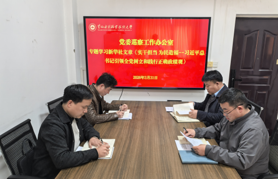 331日下午,党委巡察工作办公室在行政楼325室组织开展政治理论学习活动,集中学习研讨习近平总书记《实干担当 为民造福——习近平总书记引领全党树立和践行正确政绩观》及《让愿担当、敢担当、善担当蔚然成风》两篇文章,引导全体巡察干部以正确政绩观引领巡察工作,以担当作为践行初心使命。