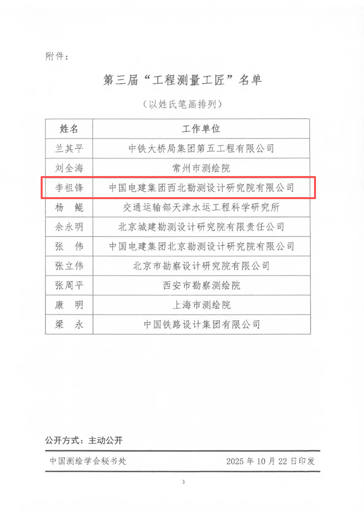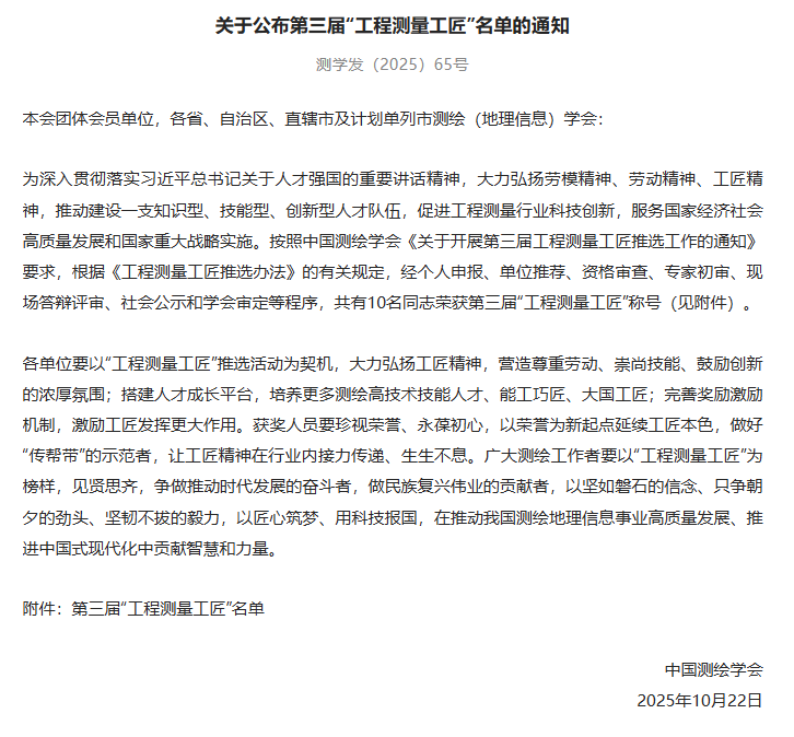 近日,中国测绘学会发布《关于公布第三届“工程测量工匠”名单的通知》(测学发〔2025〕65号),我校测绘工程学院工程测量专业优秀毕业生李祖锋荣获第三届“工程测量工匠”称号。