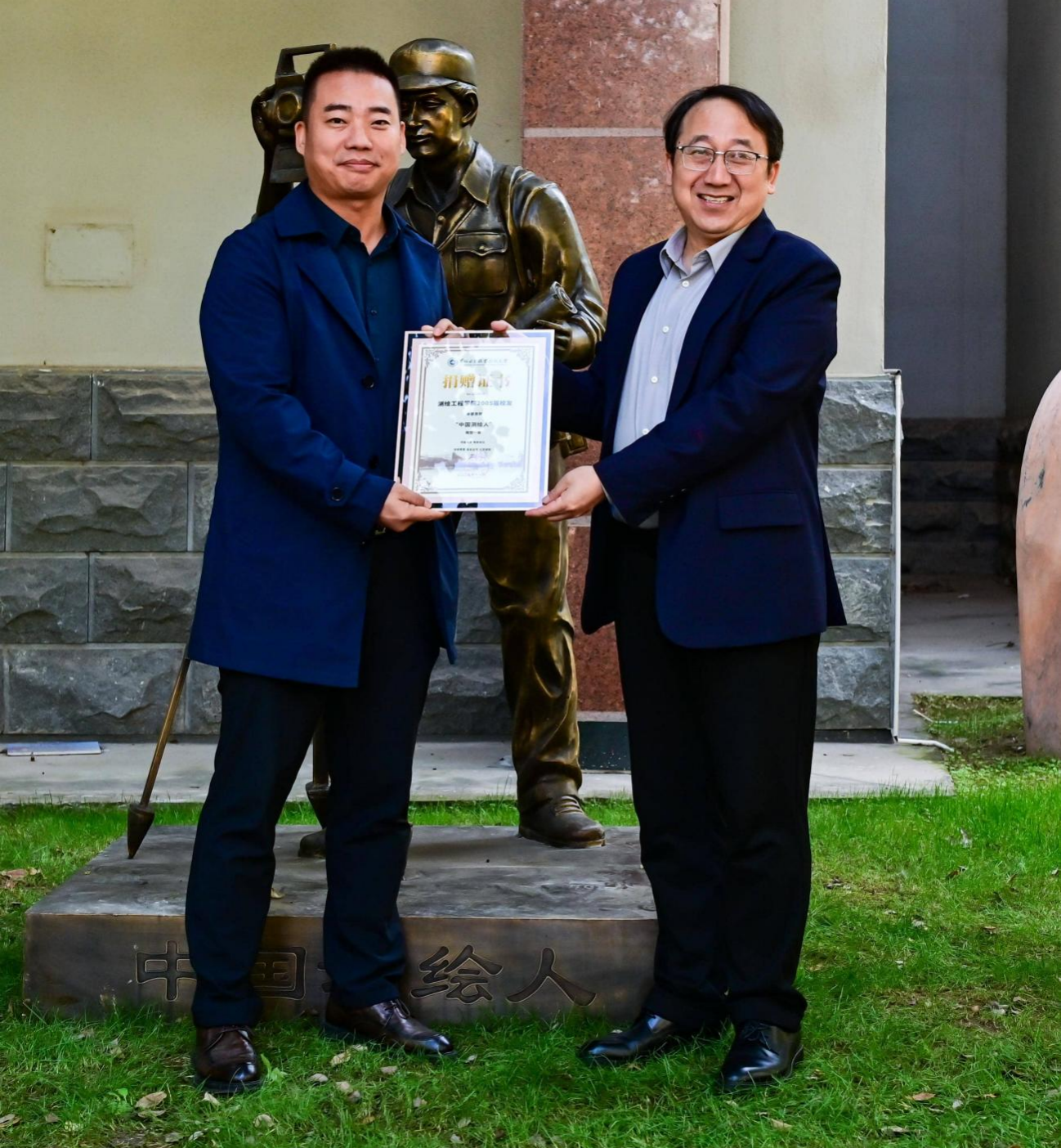 捐赠仪式上,校友集体捐资铸造的“中国测绘人”雕塑,由周校长、测绘工程学院、对外联络与合作处、校友会负责人和测绘工程学院2005届5个班代表共同揭幕,该雕塑将永久安放于测绘实训楼下,成为新生专业教育和测绘职业精神传承的第一站。周志琦向校友代表、武汉锐进铁路科技股份有限公司董事长张鑫颁发捐赠证书。