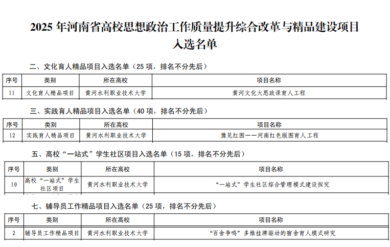 近日,中共河南省委教育工委、河南省教育厅公布了2025年河南省高校思想政治工作质量提升综合改革与精品建设项目入选名单,我校喜获佳绩,文化育人精品项目《黄河文化大思政课育人工程》,实践育人精品项目《豫见红图——河南红色版图育人工程》,高校“一站式”学生社区风采展示项目《“一站式”学生社区综合管理模式建设探究》,辅导员工作精品项目《“百舍争鸣”多维挂牌驱动的宿舍育人模式研究》共4个项目成功入选,学校思想政治工作取得新突破。