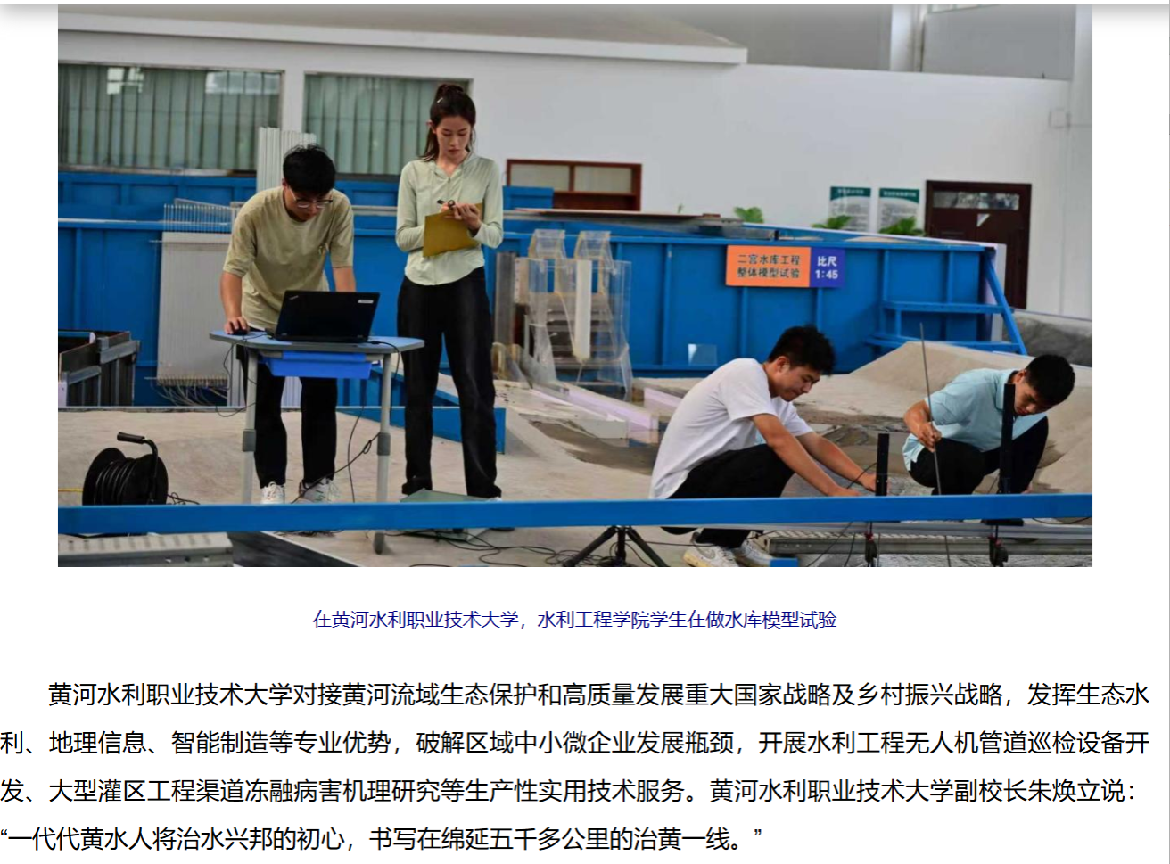 作为全国水利行业第一所公办职业本科院校,学校始终坚守“治黄河,兴水利”的办学初心,将自身发展深度融入黄河流域生态保护和高质量发展等重大国家战略。学校围绕国家“江河战略”创新黄河文化特色育人生态,建成服务黄河流域生态保护和高质量发展战略的重要职教支点,为中国职业教育改革发展贡献了“黄水模式”,为现代职业教育体系建设提供了“黄水经验”,践行了教育强国的职教担当。新华网在报道中指出,黄河水利职业技术大学对接黄河流域生态保护和高质量发展重大国家战略及乡村振兴战略,发挥生态水利、地理信息、智能制造等专业优势,破解区域中小微企业发展瓶颈,开展水利工程无人机管道巡检设备开发、大型灌区工程渠道冻融病害机理研究等生产性实用技术服务。