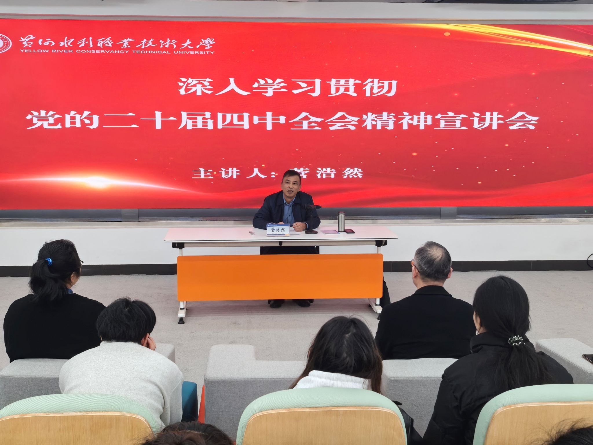 宣讲过程中,校领导们紧扣党的二十届四中全会公报核心内容,结合学校“双高计划”建设、职业本科发展定位及水利行业特色,从全会的重大历史意义、“十五五”时期发展战略部署、教育强国建设的实践要求等方面,对全会精神进行系统阐释和深入解读。杨士恒围绕“强化思想引领、凝聚发展合力”,强调要把全会精神融入立德树人全过程,引导师生将个人理想融入国家水利事业发展大局,在服务黄河流域生态保护和高质量发展中彰显职教担当;菅浩然聚焦“产教融合、科教融汇”,结合专业建设与实训教学实际,解读了全会关于“发展新质生产力”的部署要求,提出要优化专业布局、深化校企合作,提升技术技能人才培养与行业需求的契合度;朱焕立从“高质量发展”角度出发,围绕学科建设、科研创新、社会服务等关键点,勉励师生以全会精神为指引,在水利工程技术攻关、乡村振兴水利帮扶等领域主动作为;周志琦结合学生成长成才需求,强调要将全会精神转化为育人实效,引导青年学子锤炼过硬本领、树立“技能报国”志向,在水利职业赛道上实现人生价值;刘许亮立足全面从严治党要求,从“统筹发展和安全”角度,强调要以全会精神为遵循,筑牢校园安全防线,营造风清气正的育人环境。