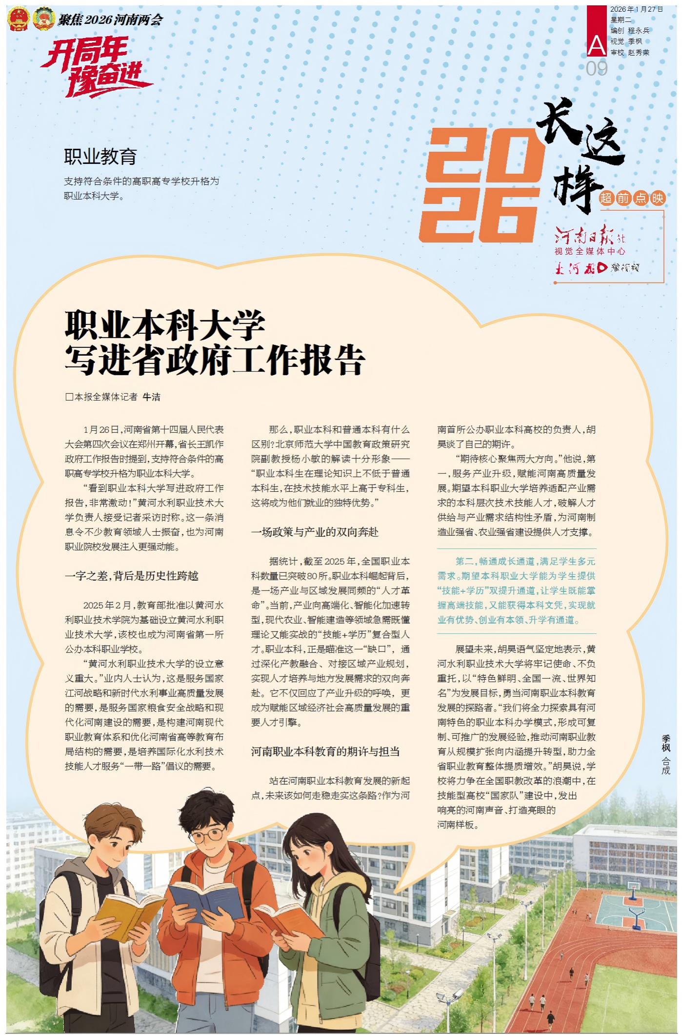 1月27日,《大河报》以《职业本科大学写进省政府工作报告》为题,专题报道了学校作为河南省第一所公办本科职业学校的升本历程与发展成效,解读了从“学院”到“大学”,一字之差的深刻变革,并专访校长胡昊,深度解读职业本科教育的转型意义与实践路径。