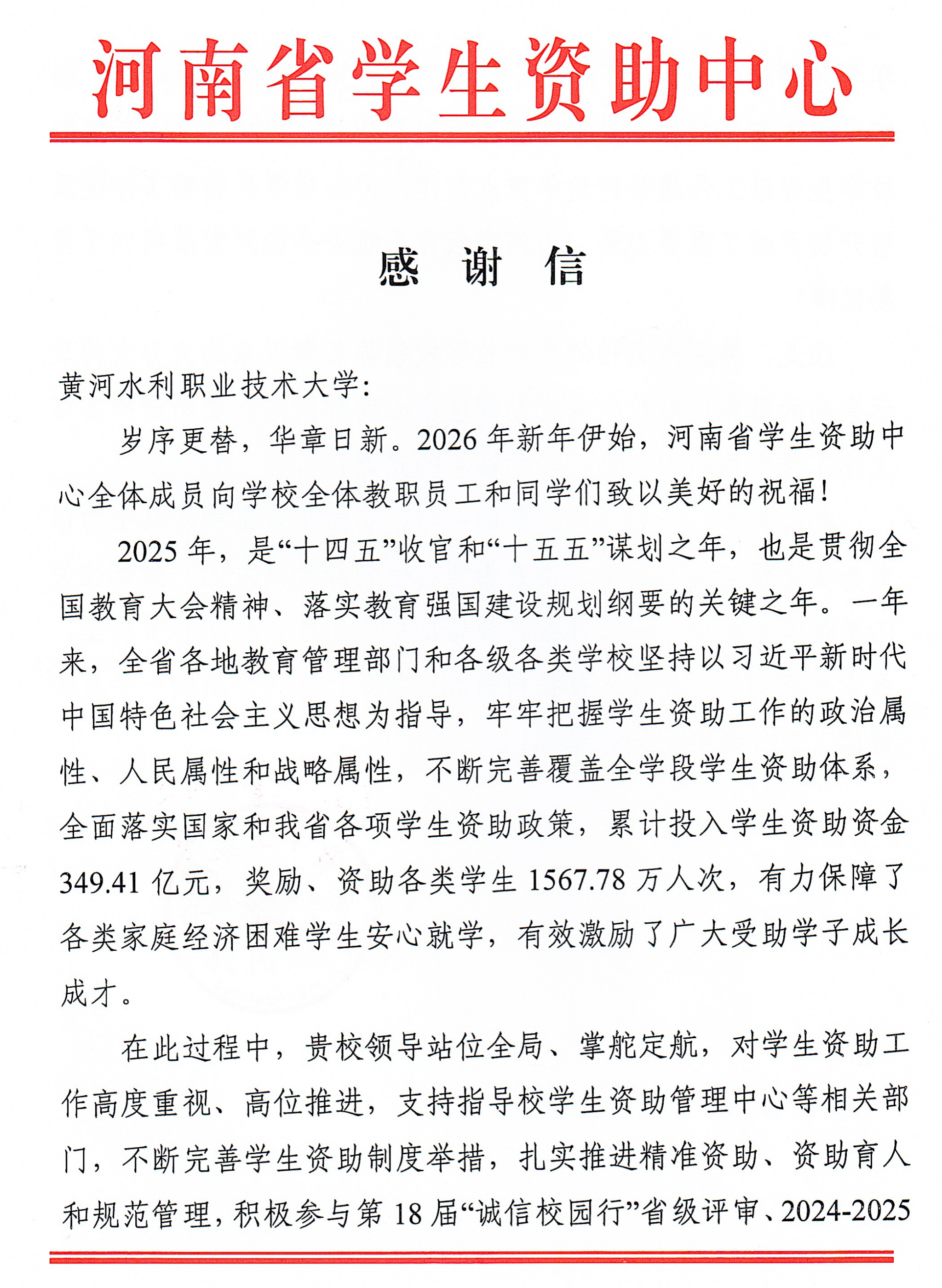 近日,河南省学生资助中心向我校发来感谢信。信中,省资助中心高度肯定了学校在推动全省学生资助工作高质量发展中的突出贡献,并对学校在政策落实、精准资助、育人成效及重点工作参与等方面的出色表现予以表扬!