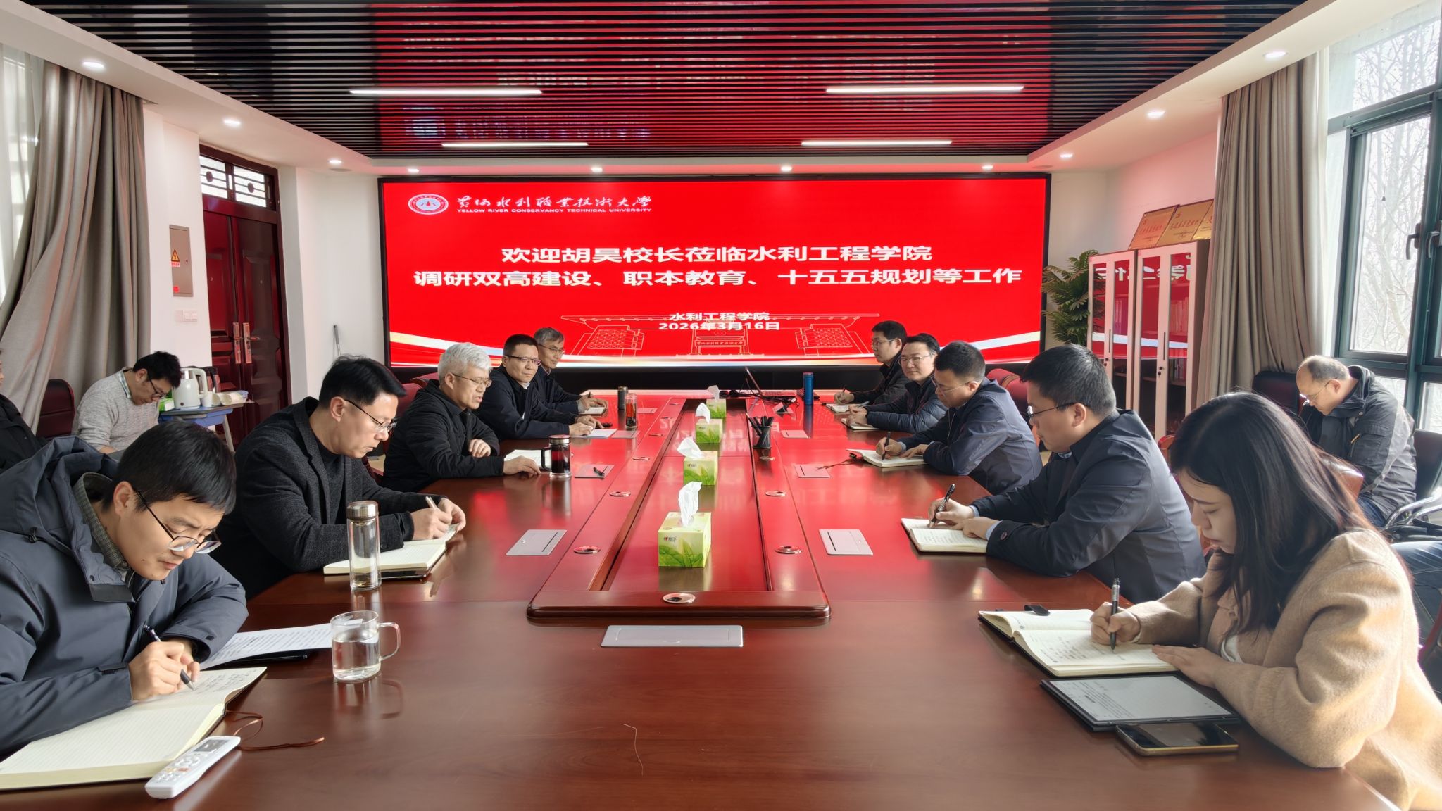 近日,党委副书记、校长胡昊深入水利工程学院,就第二轮“双高计划”建设、职业本科专业建设及“十五五”规划编制等重点工作开展专题调研指导。党政办公室、发展规划处、双高建设办公室等相关部门负责人陪同调研。水利工程学院领导班子、各教研室主任及副科级以上干部参加调研座谈。
