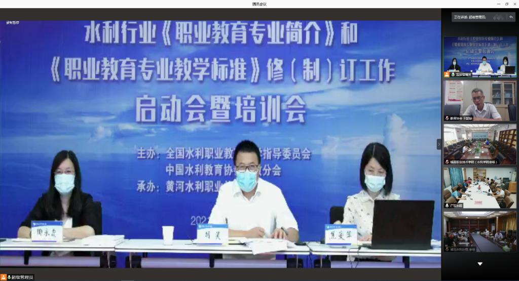 8月10日,由我校承办的水利行业《职业教育专业简介》和《职业教育专业教学标准》(以下简称《简介》和《标准》)修(制)工作启动会暨培训会顺利召开。教育部行指委工作办公室常务副主任王国川、中国水利教育协会副会长兼秘书长王韶华、我校校长胡昊、副校长焦爱萍出席会议,来自25所水利职业院校、4所应用型本科院校、8家水利企事业单位的领导、水利类专业简介和教学标准研制专家近320人参加会议,会议由胡昊主持。根据疫情防控要求,本次会议采用线上的形式召开。