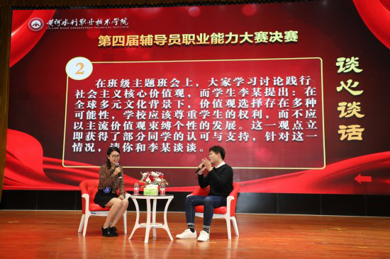 决赛中,在谈心谈话环节,选手们用幽默的话语打开学生的心扉,用认真的态度解决学生遇到的问题。在主题演讲环节,有的选手激情澎湃、有的选手娓娓道来、有的选手誓言铮铮、有的选手深情表述,他们出色的表现赢得了阵阵掌声。最后辅导员代表更是以一首诗朗诵《我们是光荣的辅导员》向大家展示了我校辅导员队伍昂扬向上的精神风貌。