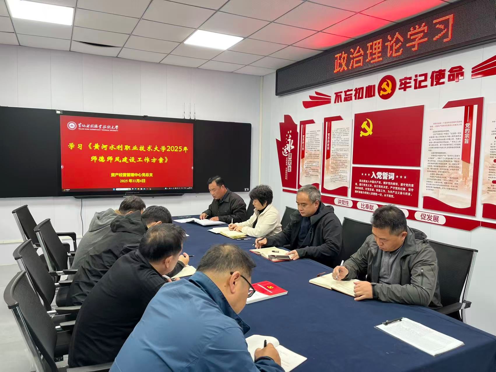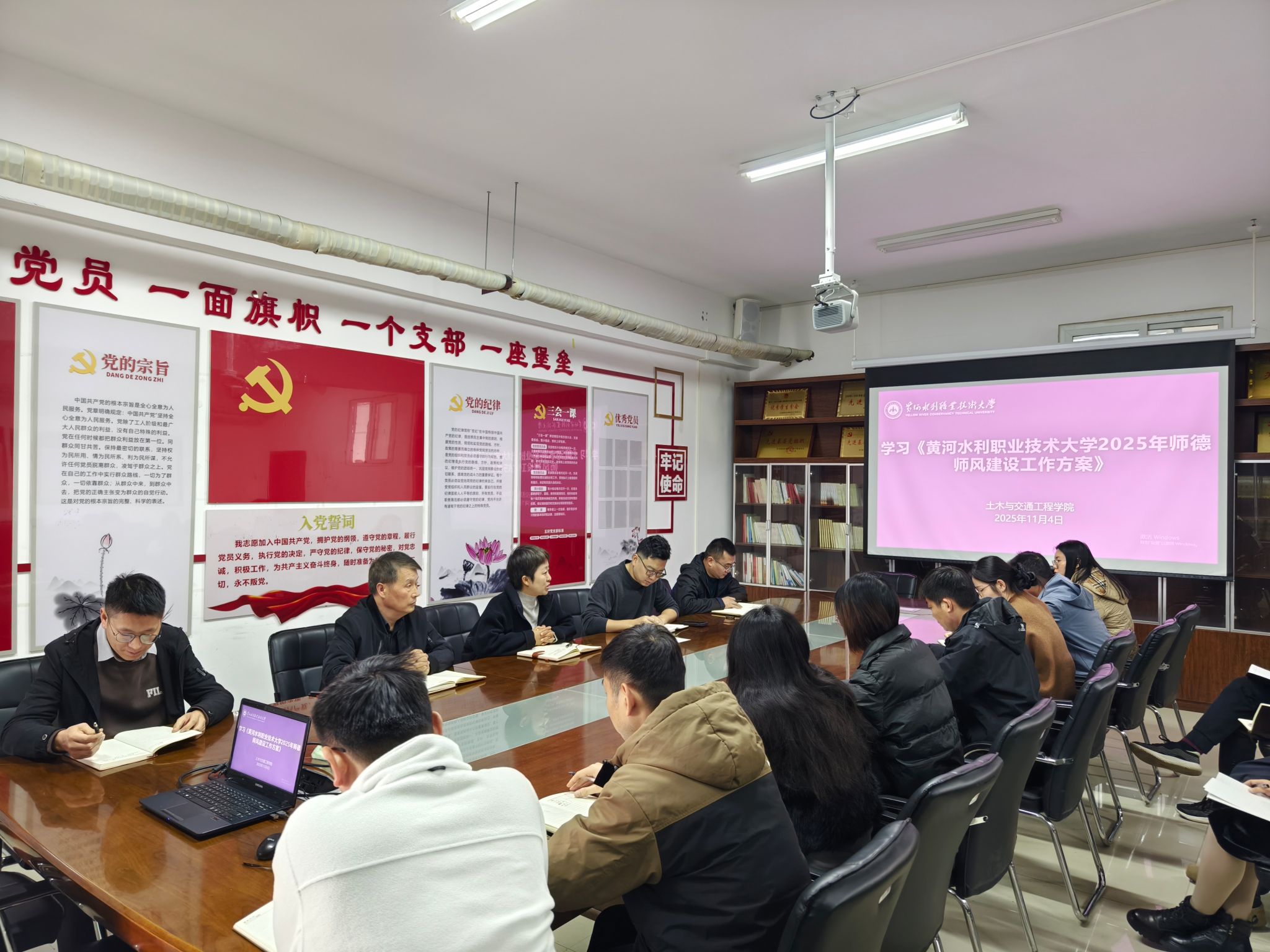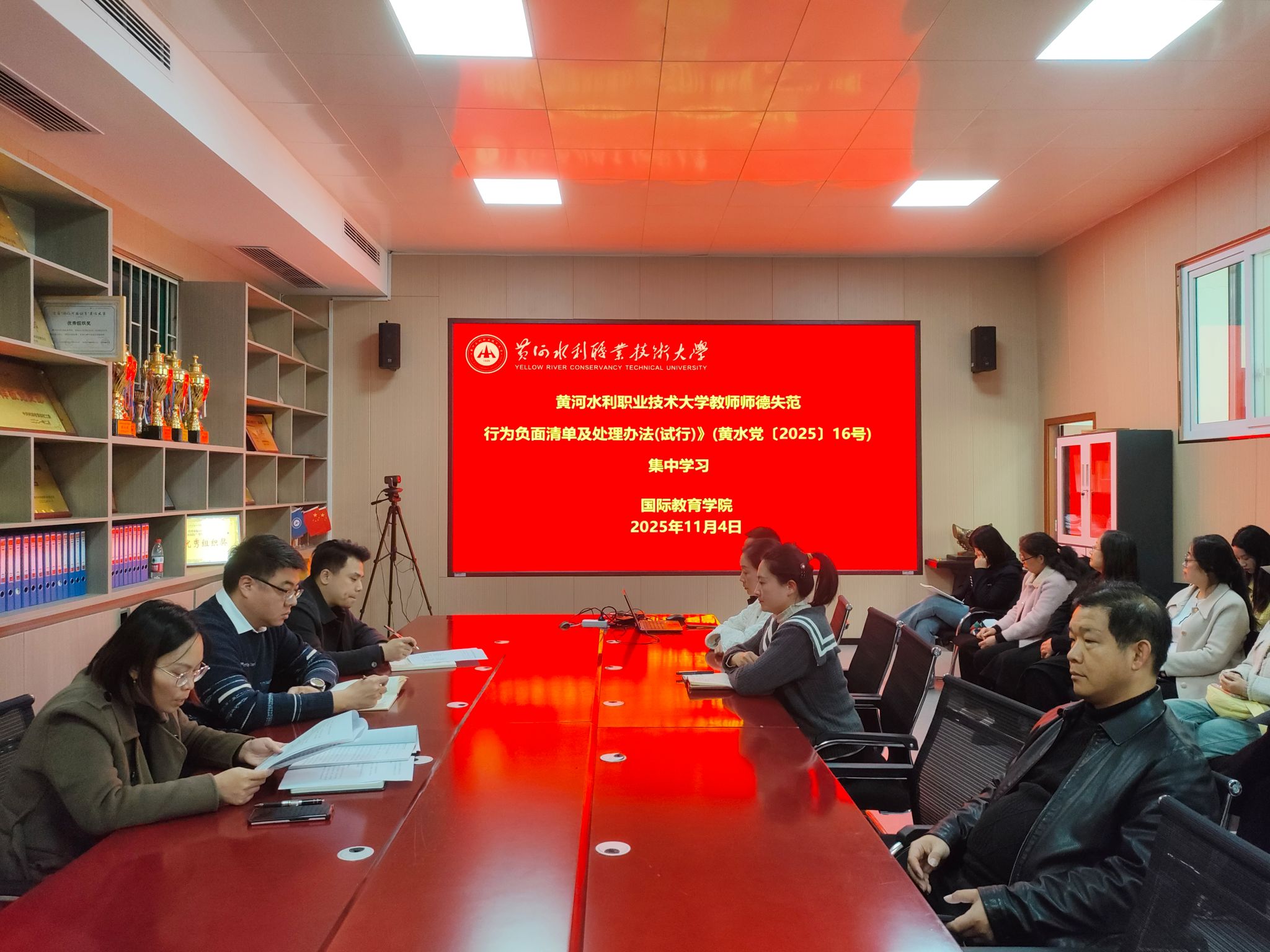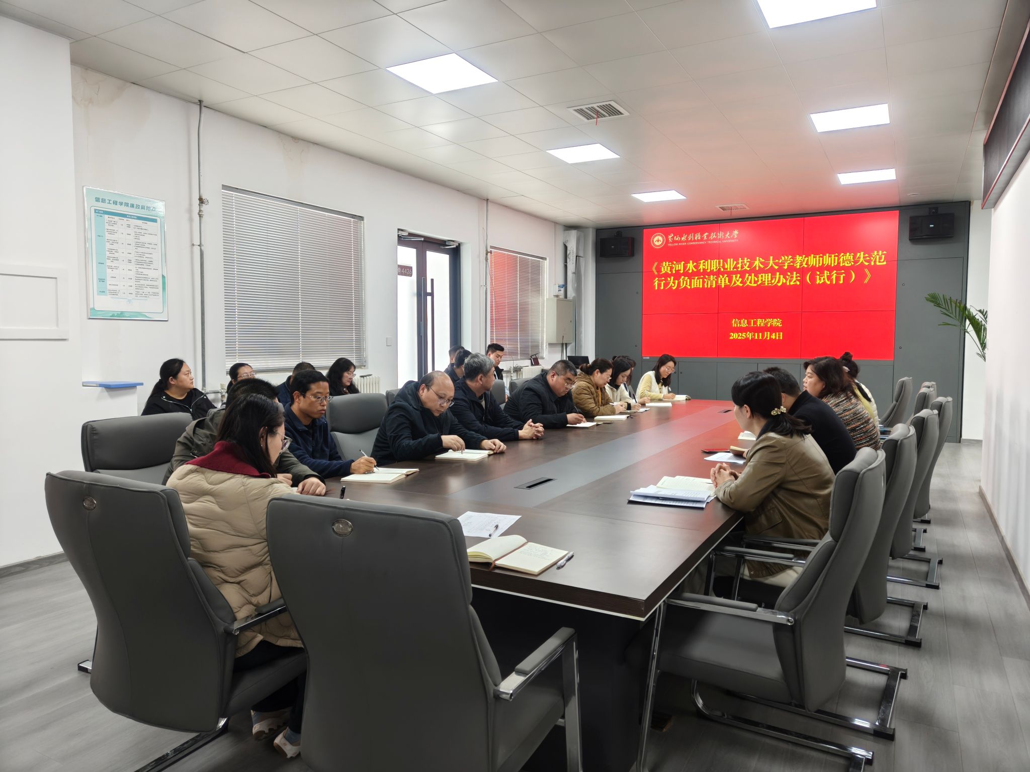 为贯彻落实《黄河水院2025年下半年政治理论学习及思想道德教育计划》学习要求,11月4日,全校各部门、各单位分别组织教职工传达学习《黄河水利职业技术大学教师师德失范行为负面清单及处理办法(试行)》(黄水党〔2025〕16号)和《黄河水利职业技术大学2025年师德师风建设工作方案》,引导全校教师准确把握师德师风建设第一标准的深刻内涵,不断提升师德师风建设水平,努力构建教风清明、校风清正的育人环境,助力学校高质量发展。(供图:各相关部门)