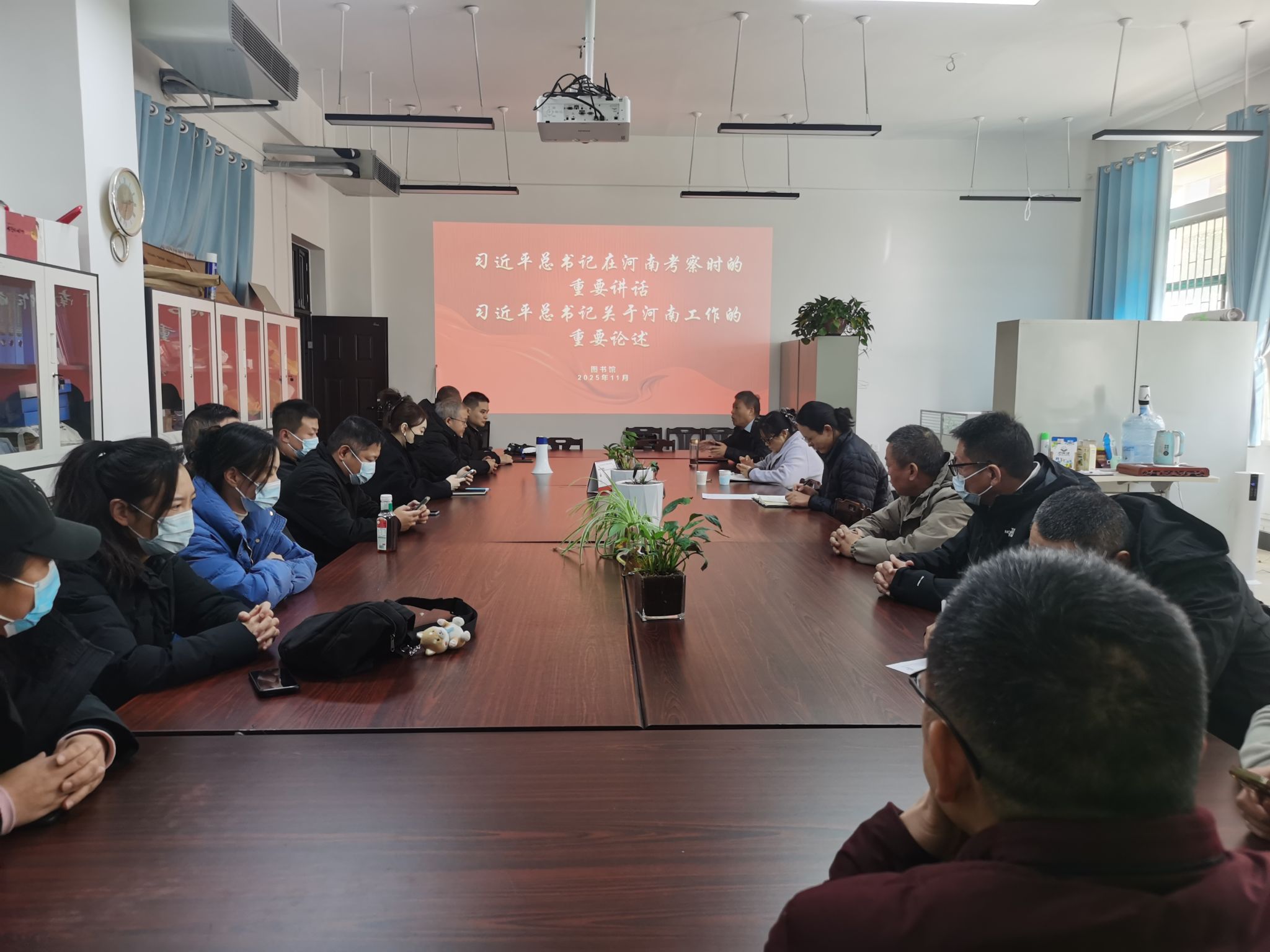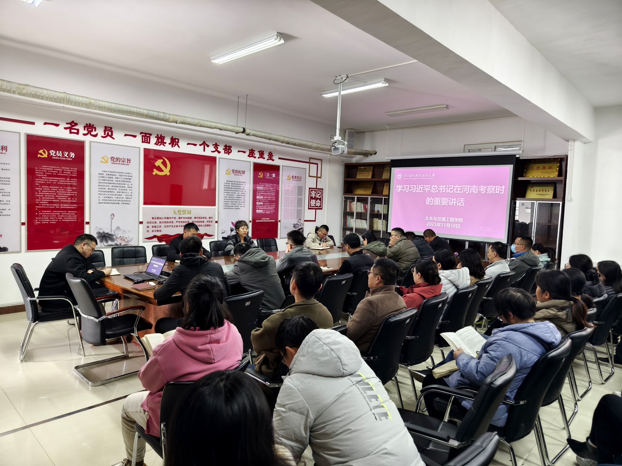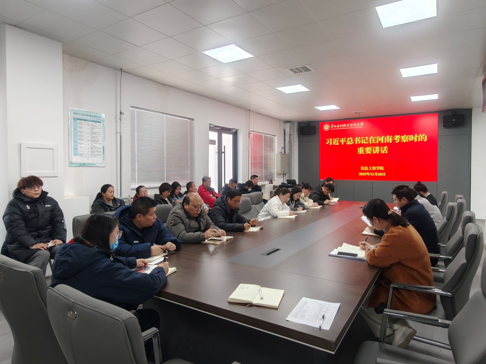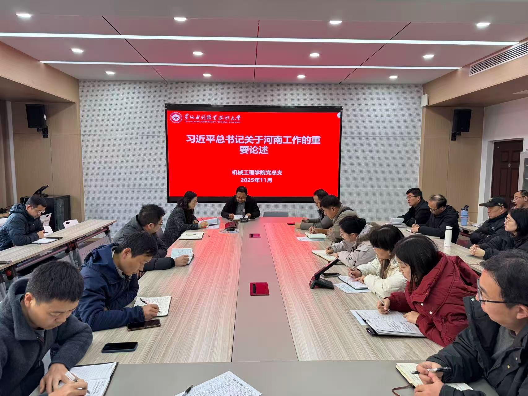 为贯彻落实《黄河水利职业技术大学2025年下半年政治理论学习及思想道德教育计划》学习要求,11月18日,全校各部门、各单位分别组织教职工传达学习习近平总书记在河南考察时的重要讲话和习近平总书记关于河南工作的重要论述,引导全校教师深刻领会习近平总书记重要讲话精神的核心要义和实践要求,自觉将讲话精神融入日常教学和理论研究工作中,引导广大青年学生坚定理想信念,投身强国建设。(供图:各相关部门)