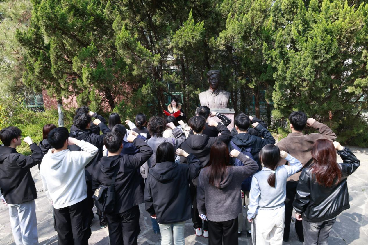 鲲鹏山吴祖泰烈士雕像旁,校学生会成员刘长昊同学结合吴祖泰烈士扎根修渠一线、坚守岗位不言弃的事迹,分享了对新时代青年责任与担当的理解,号召同学们脚踏实地,把个人成长融入国家发展大局;红旗渠精神传承者协会成员胡雨鑫同学围绕烈士不畏艰险、舍生忘死的奉献精神分享学习体会,表达了传承英烈精神、锤炼过硬本领、以青春之力践行报国之志的坚定决心;校团委程潇菡老师引导同学们要以英烈为标杆,把对先烈的崇敬之情转化为勤学不辍、实干担当的内生动力,在时代浪潮中勇担青年使命,不负韶华、不负人民;全体师生面向烈士纪念雕像庄严宣誓,以铿锵誓言彰显对英烈的深切缅怀与接续奋斗的郑重承诺。