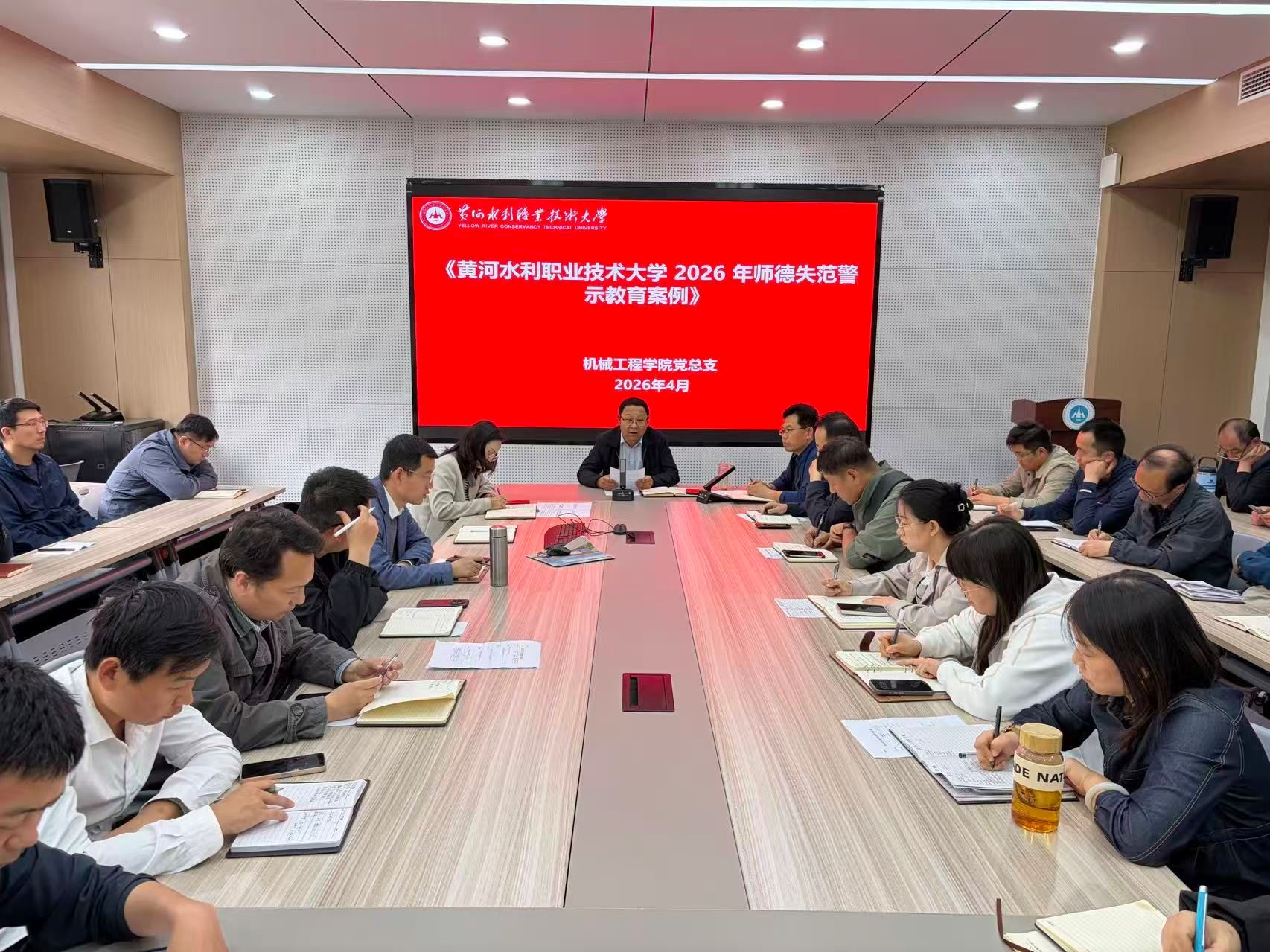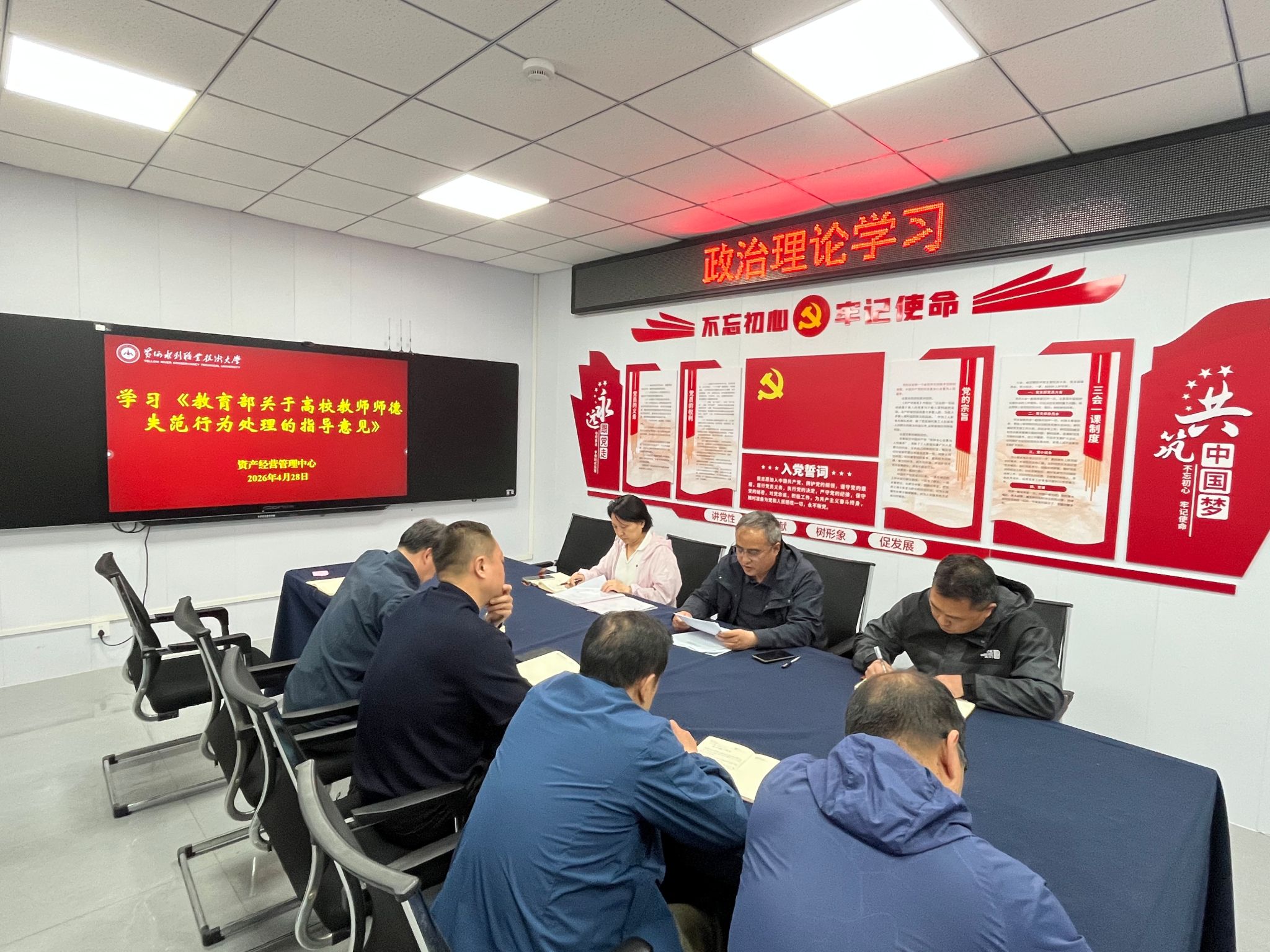 为贯彻落实《黄河水利职业技术大学2026年上半年教职工政治理论学习及思想道德教育计划》学习要求,4月28日,全校各部门、各单位分别组织教职工传达学习《教育部关于高校教师师德失范行为处理的指导意见》《新时代高校教师职业行为十项准则》《教育部等六部门关于加强新时代高校青年教师队伍建设的指导意见》(教师〔2025〕5号)《黄河水利职业技术大学教师师德师风评价考核办法(试行)》《黄河水利职业技术大学教师师德失范行为负面清单及管理办法(试行)》(黄水党〔2025〕16号)《黄河水利职业技术大学2026年师德失范警示教育案例》,引导全校教师规范履职行为,落实立德树人根本任务,弘扬新时代高校教师道德风尚,努力建设有理想信念、有道德情操、有扎实学识、有仁爱之心的高校教师队伍。(供图:各相关部门)