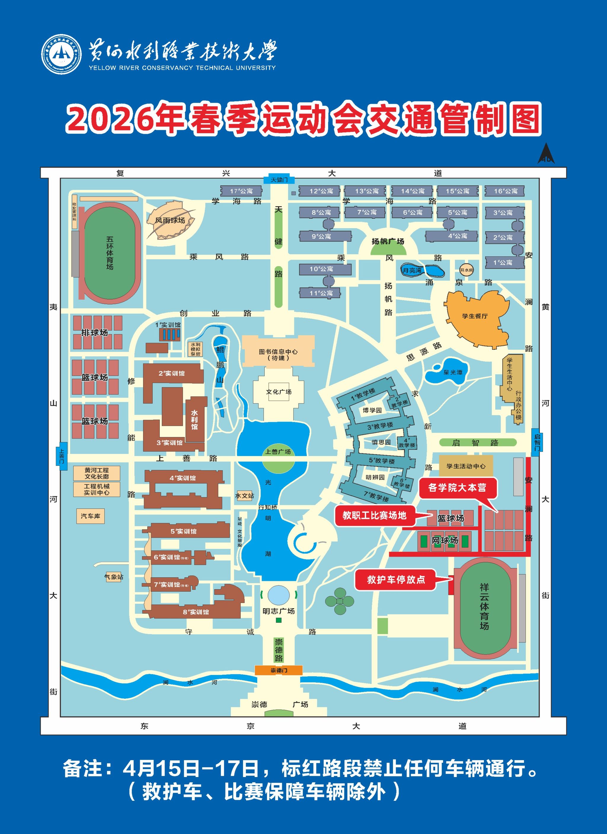 1.比赛期间学校东南体育场及周边道路禁止任何车辆通行,救护车、比赛保障车辆除外,具体信息详见《2026年春季运动会交通管制图》;