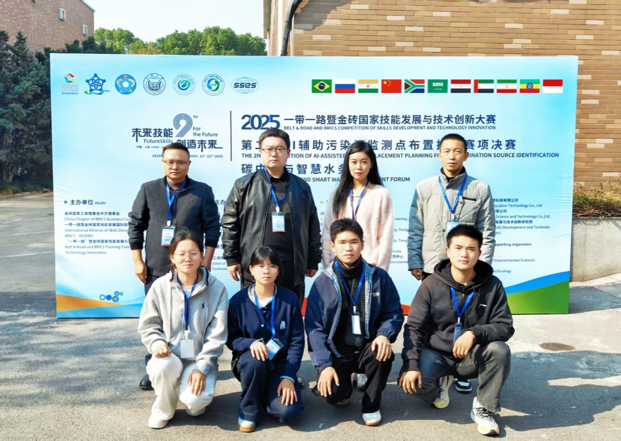 大赛中我校参赛队伍的优异表现,离不开学校领导与相关部门的高度重视和鼎力支持。未来,环境工程学院将持续立足 “AI + 环境” 融合创新赛道,紧跟 AI 技术与环境工程领域的发展趋势,聚焦高素质技术技能人才培养,着力打造兼具国际视野、创新精神与实践能力的专业队伍,既为 “AI + 环境” 产业升级注入鲜活动能,也为金砖国家及 “一带一路” 沿线国家的生态环保数字化技术合作与发展贡献更大力量。