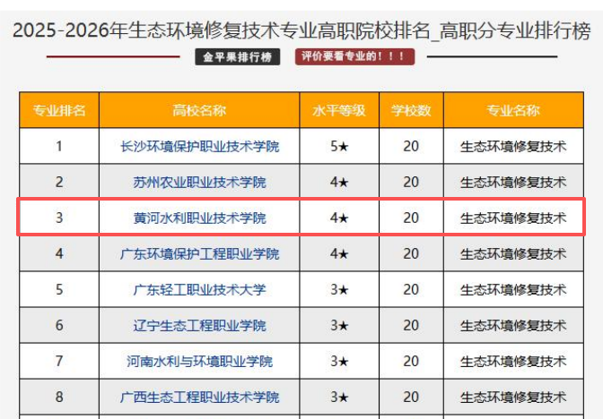 黄河水利职业技术学院生态环境修复技术专业2020年入选“双高计划”骨干专业群。本专业师资力量雄厚,目前拥有专业教师16人,其中河南省科学技术带头人1人,博士8人,具有高级职称6人,企业兼职教师10人。专业实训设备先进,拥有完整的校内外实训环节,注重终身学习能力的培养指导,学生动手能力强。根据权威统计,2025-2026年位居全国生态环境修复技术专业排行榜第3名。近年来,本专业学生在化学实验室技术、实验室安全技术、智慧农业种植大赛、生态保护与环境治理、“互联网+”等国家级和省级技能大赛上屡获佳绩,毕业生就业率一直稳居学校前列。学生专升本率一直名列前茅,部分学生继续完成研究生阶段学习,进入郑州大学等高等学府进行深造。