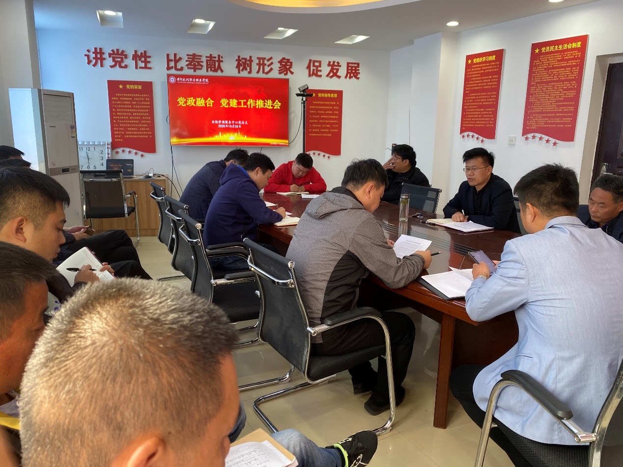 10月26日上午,后勤党总支在四楼会议室召开党政融合、党建工作推进会,会议由总支书记王建设主持,后勤总支委员、各支部委员参加会议。