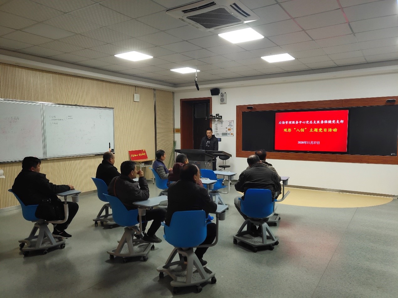 2020年11月27日医务保健党支部在教学楼7212教室开展党日活动,组织党员观看电影《八佰》,活动由支部书记张文欢主持,支部全体党员参加。