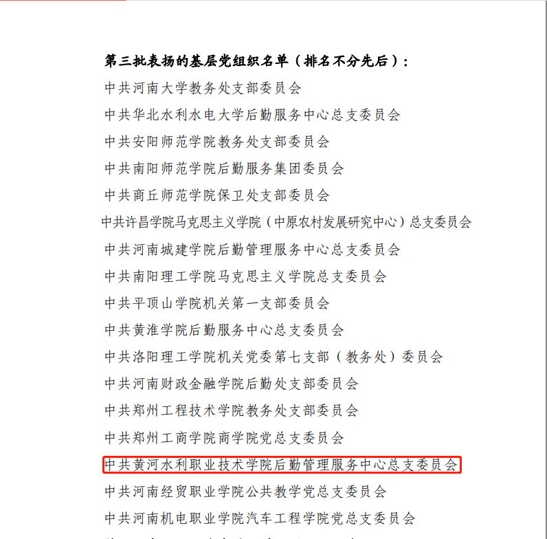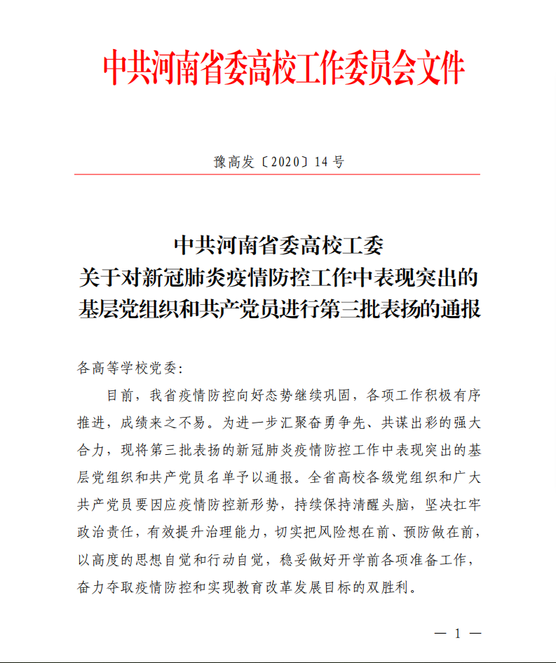 4月2日省委高校工委下发《关于对新冠肺炎疫情防控工作中表现突出的基层党组织和共产党员进行第三批表彰的通报》(豫高发【2020】14号),后勤管理服务中心党总支受到通报表彰。