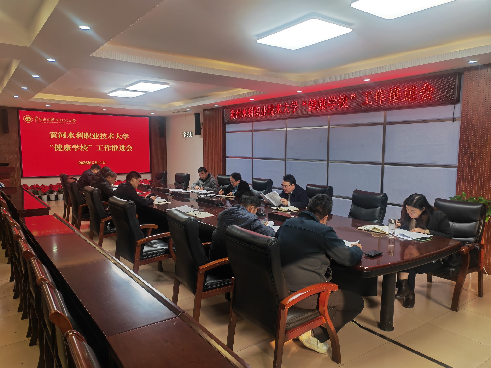 为全面贯彻教育部《关于全面推进健康学校建设的指导意见》精神,扎实推进学校健康学校试点建设工作,2026年3月11日,黄河水利职业技术大学召开健康学校工作推进会。学校副校长周志琦出席会议并讲话,党政办公室、后勤管理服务中心等相关职能部门负责人参加会议。