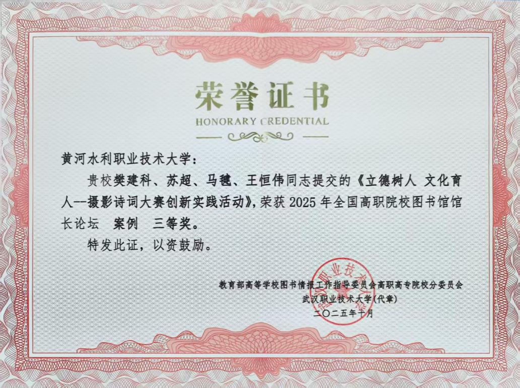 近日,在教育部高等学校图书情报工作指导委员会高职高专院校分委员会主办的“2025年全国高职院校图书馆馆长论坛”案例与论文征集评选活动中,我校图书馆凭借《立德树人 文化育人——摄影诗词大赛创新实践活动》案例,与省内另一所高校图书馆共同斩获三等奖,这也是我校首次在该类国家级评选中获奖,成功填补了学校在此领域的奖项空白。
