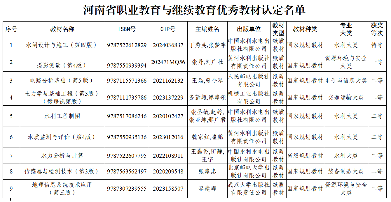 根据《河南省教育厅办公室关于开展河南省教材等级评定暨第二届全国教材建设奖全国优秀教材推荐工作的通知》(教办思政〔2025〕184号)精神,省委教育工委、省教育厅组织开展了全省教材等级评定工作,评选出职业教育与继续教育类优秀教材150项,我校丁秀英,张梦宇教授主编的《水闸设计与施工(第四版)》等9部教材入选并获奖,其中特等奖1部,一等奖1部,二等奖7部。
