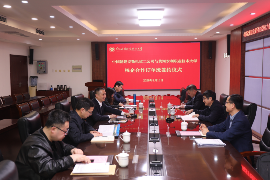 2026年4月16日,我校与中国能源建设集团安徽电力建设第二工程有限公司(以下简称为安徽电建二公司)校企合作订单班签约仪式在行政楼第一会议室顺利举行。出席签约仪式的企业领导有安徽电建二公司党委委员、副总经理、工会主席白江文,首席信息官、人力资源部主任夏长银,检修公司资源管理部主任张健。我校副校长朱焕立,教务处、机械工程学院、电气工程学院相关负责人参加了此次签约会议。仪式由教务处处长陶永霞主持。