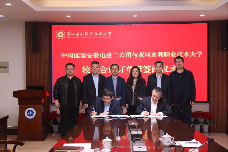 随后,在全体与会人员的共同见证下,我校副校长朱焕立和安徽电建二公司副总经理白江文代表双方单位共同签署了校企合作订单班协议。