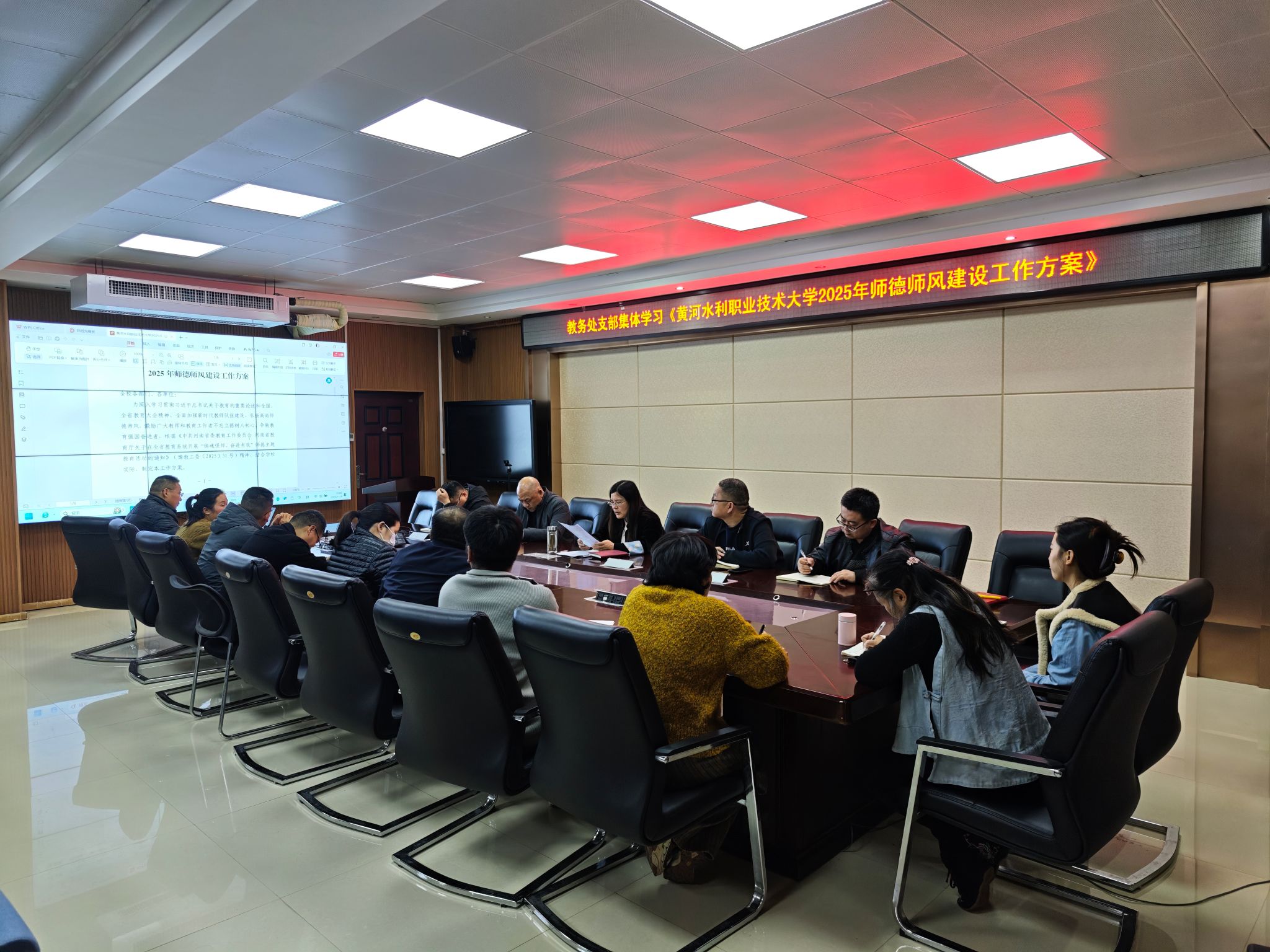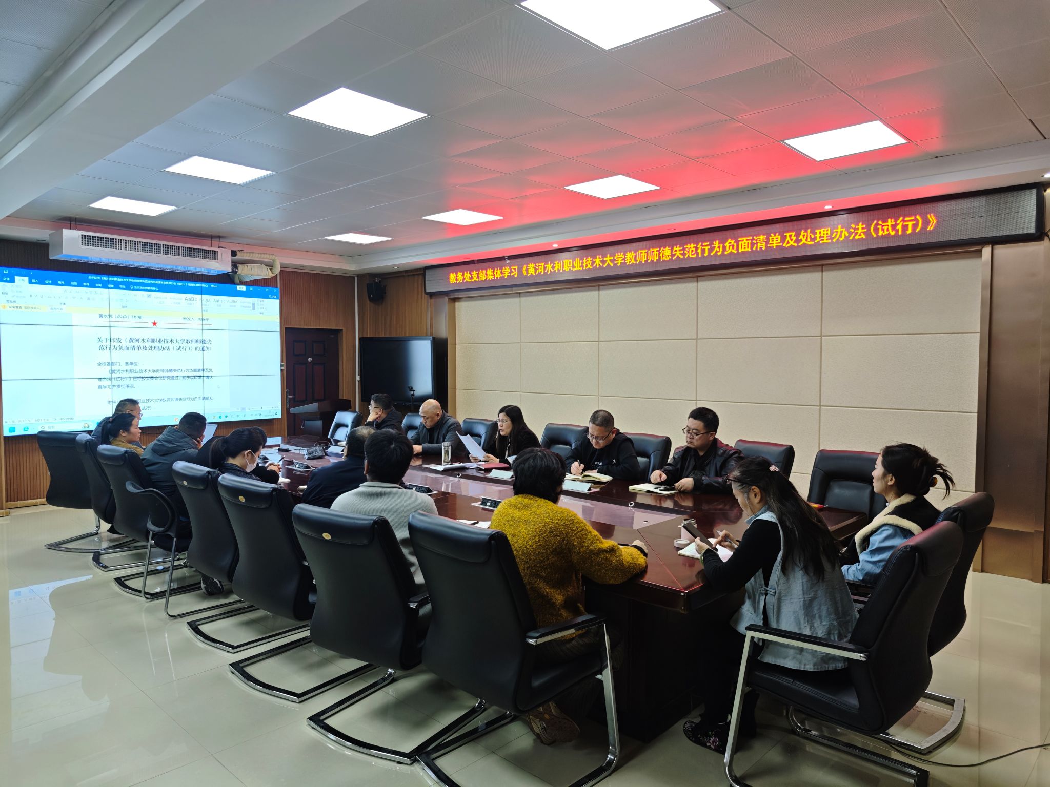 2025年11月4日(周二)下午,教务处组织全体教职员工开展政治理论学习,专题学习《黄河水利职业技术大学2025年师德师风建设工作方案》及《黄河水利职业技术大学教师师德失范行为负面清单及处理办法(试行)》两份文件。本次学习由教务处处长陶永霞领学,旨在深入贯彻习近平总书记关于教育的重要论述,全面落实立德树人根本任务,进一步加强教师队伍思想政治建设和职业道德建设。
