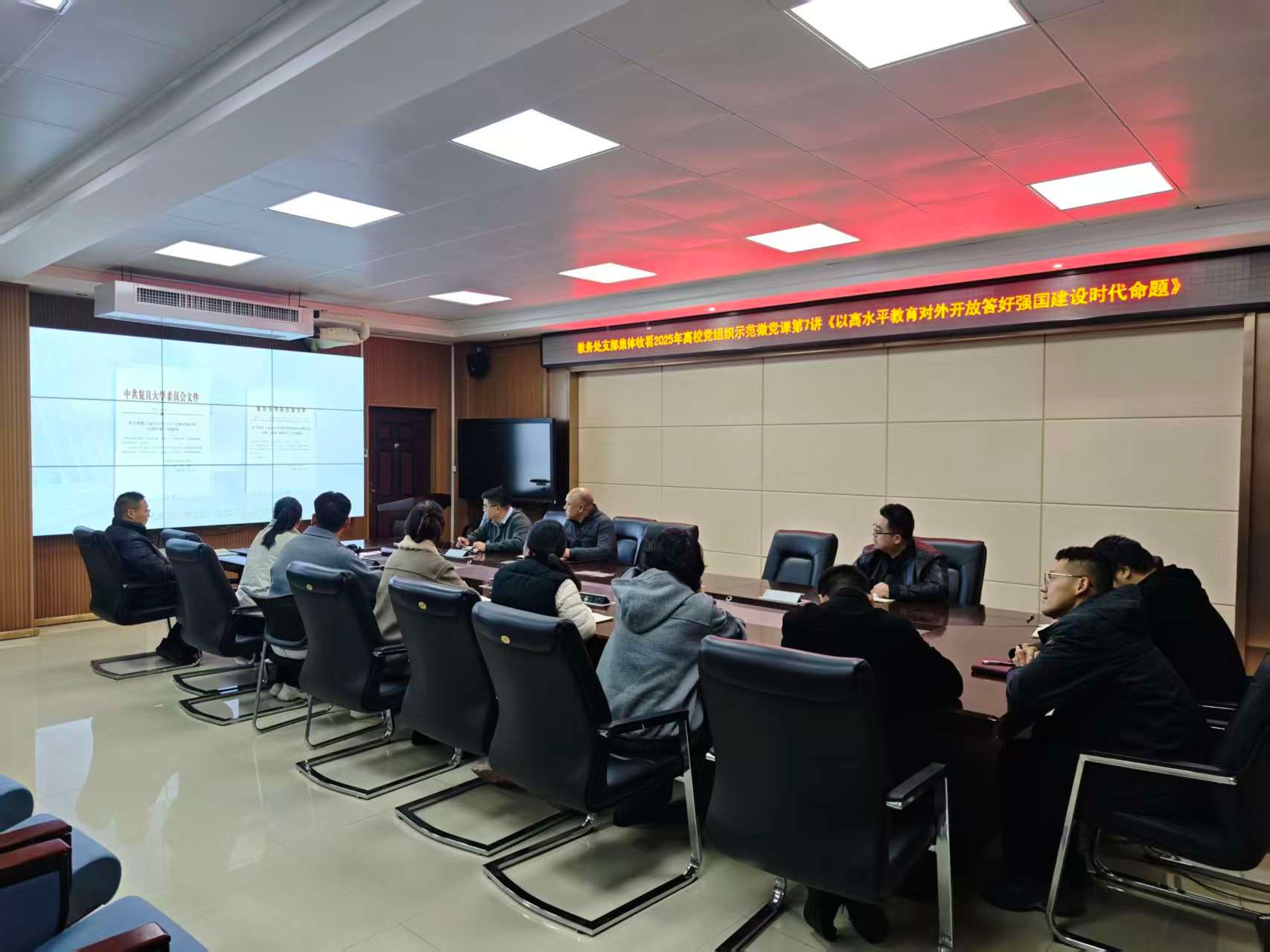2025117日下午教务处支部在教务处会议室集体收看2025年高校党组织示范微党课第7《以高水平教育对外开放答好强国建设时代命题》。本次微党课由复旦大学、厦门大学、西北农林科技大学、华南理工大学联合主讲,聚焦国际影响力主题,系统呈现高校在构建教育对外开放新格局、深化国际创新合作等方面的实践成果。