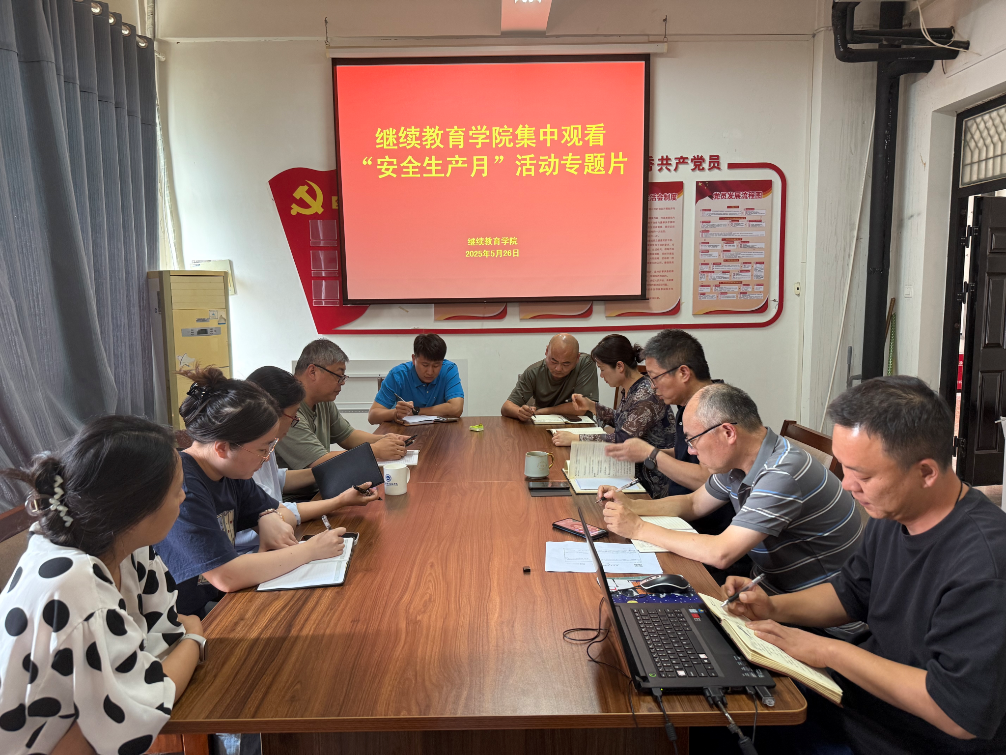 根据学校《关于开展2025年“安全生产月”活动的通知》要求,为进一步增强全体教职工的安全意识,筑牢校园安全防线,5月26日,继续教育学院组织全体教职工在会议室集中观看了“安全生产月”活动专题片。此次活动紧扣“人人讲安全、个个会应急——查找身边安全隐患”主题,通过典型案例分析和安全知识普及,强化安全责任落实,提升应急处置能力。