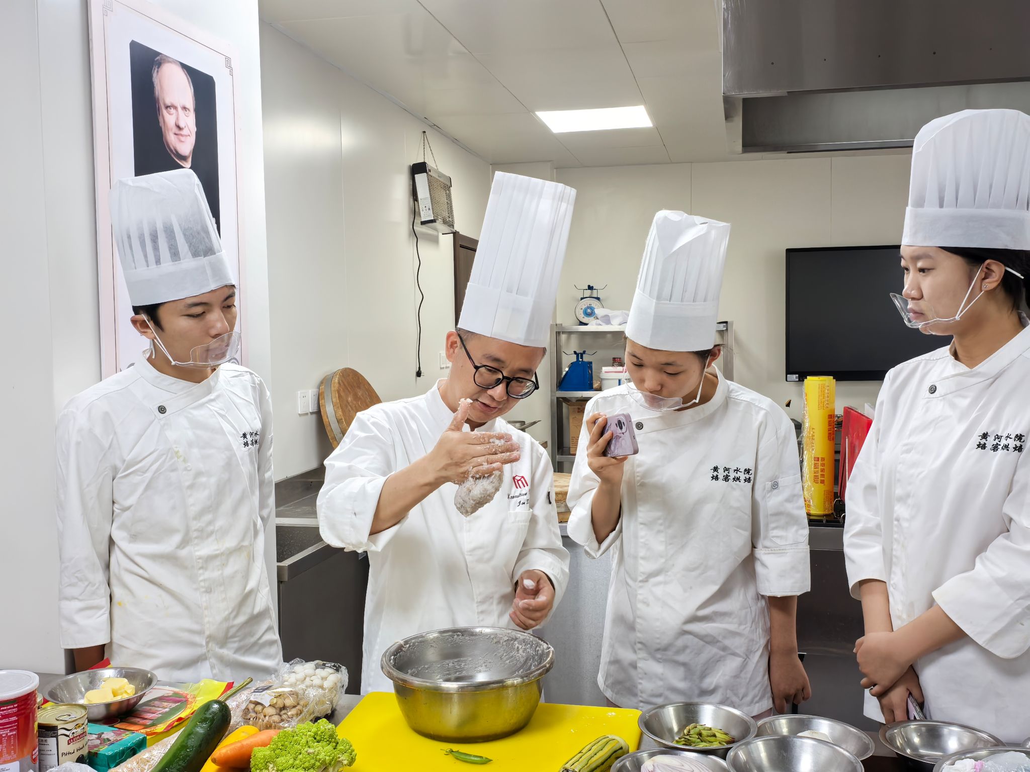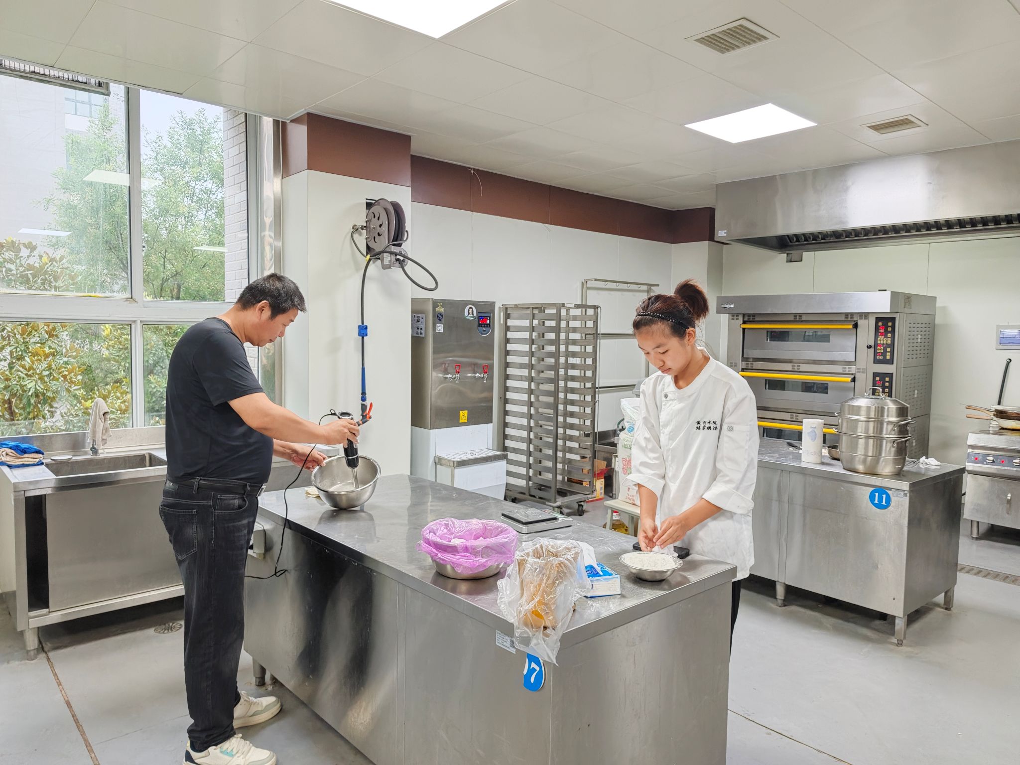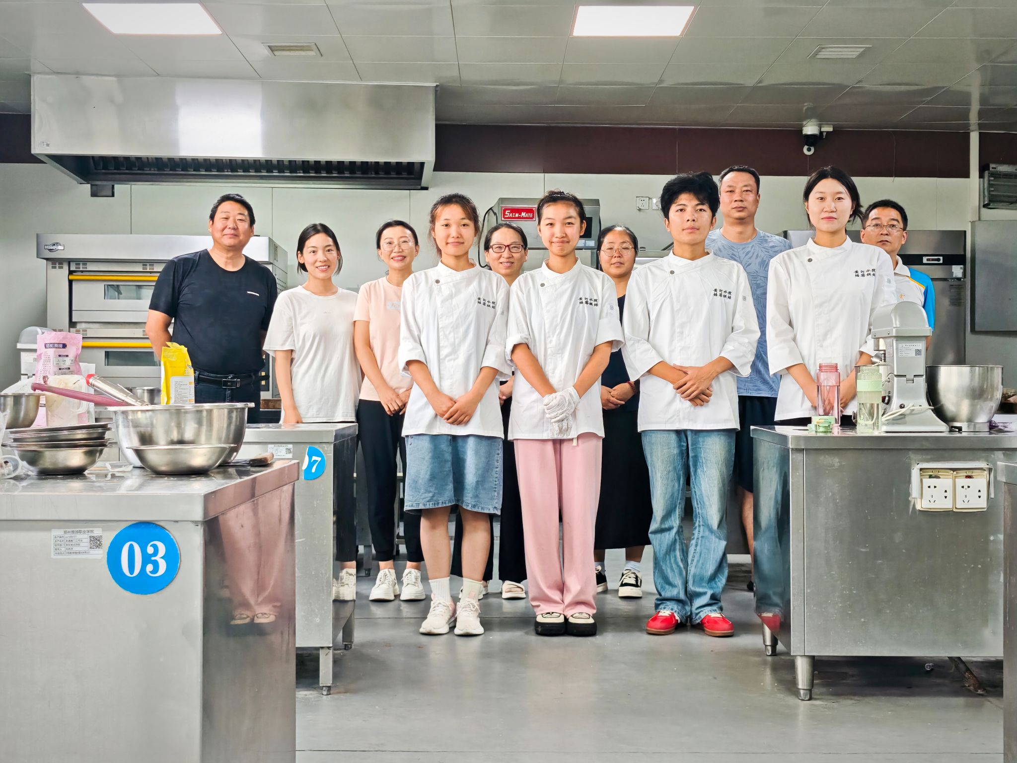 8月9日,酒店甜品师王帅老师专程来到旅游学院烘焙实训室,对参赛甜品进行专项优化。他不仅带来了新颖的创意与技法,更耐心细致地手把手教学,帮助学生掌握关键工艺,使甜品在口感、造型与稳定性上均实现质的飞跃。