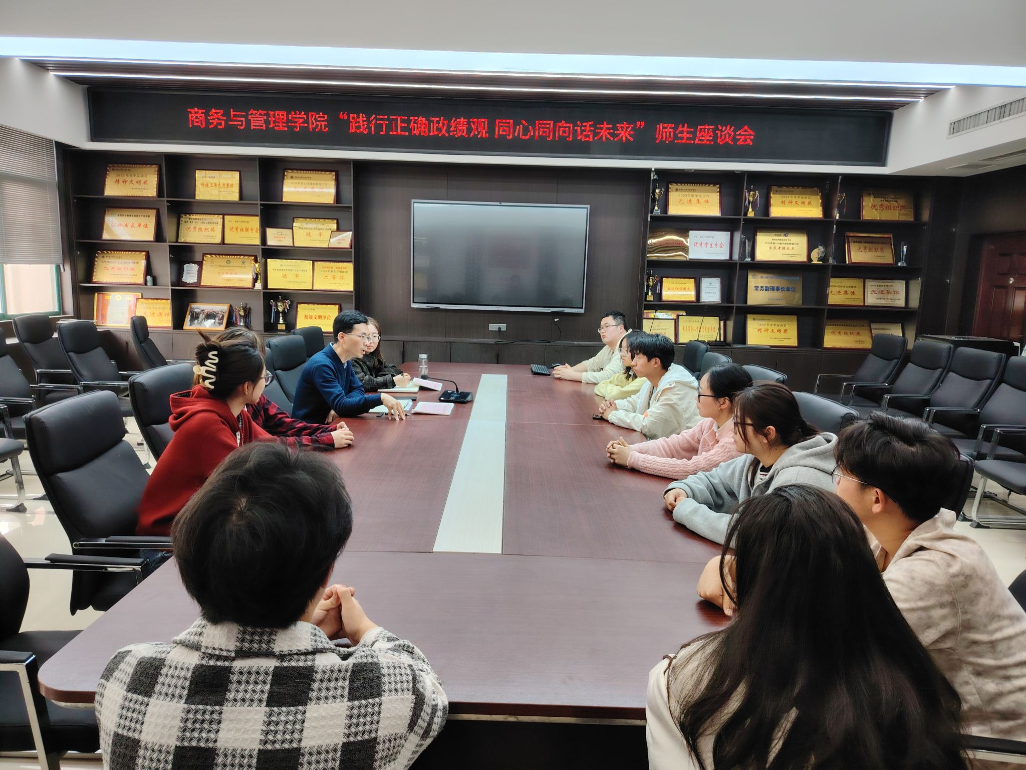 为推动树立和践行正确政绩观学习教育走深走实、见行见效,3月31日下午,商务与管理学院党总支在SY5420会议室召开“践行正确政绩观 同心同向话未来”师生座谈会,聚焦教育教学、人才培养、服务保障等工作,倾听同学们意见建议,共商学院高质量发展大计,凝聚立德树人奋进力量。学院党总支书记孙辉、副书记曹睿、辅导员及学生党员代表参加座谈。
